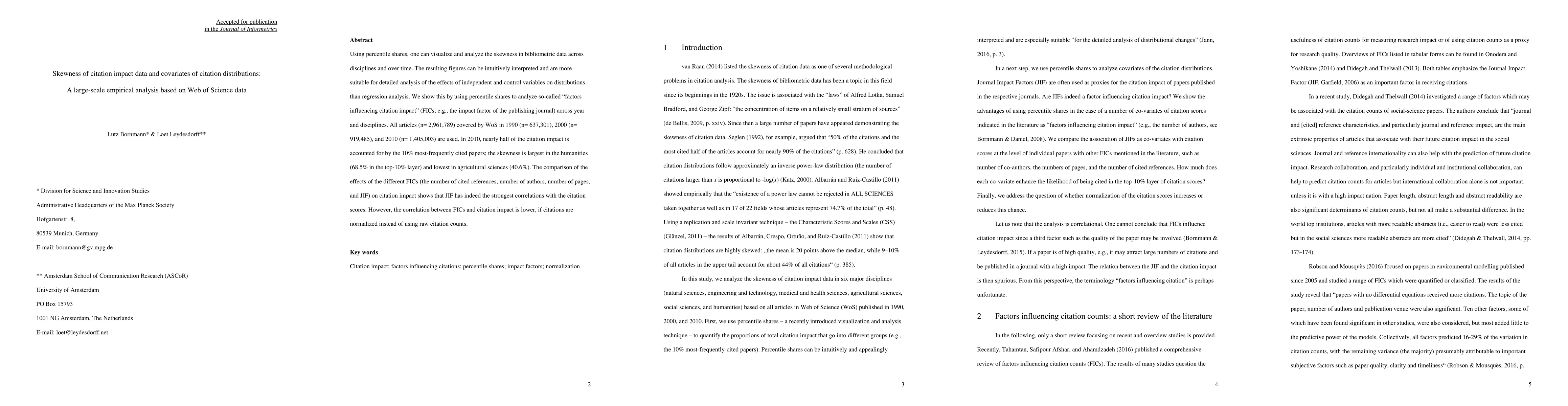 This study employs percentile shares to analyze the skewness of citation impact data across disciplines and over time using Web of Science data. It finds that the top 10% of most-cited papers account for nearly half of the citation impact in 2010, with the largest skewness in humanities and lowest in agricultural sciences. The analysis reveals that journal impact factor (JIF) has the strongest correlation with citation impact, though this correlation diminishes when citations are normalized.