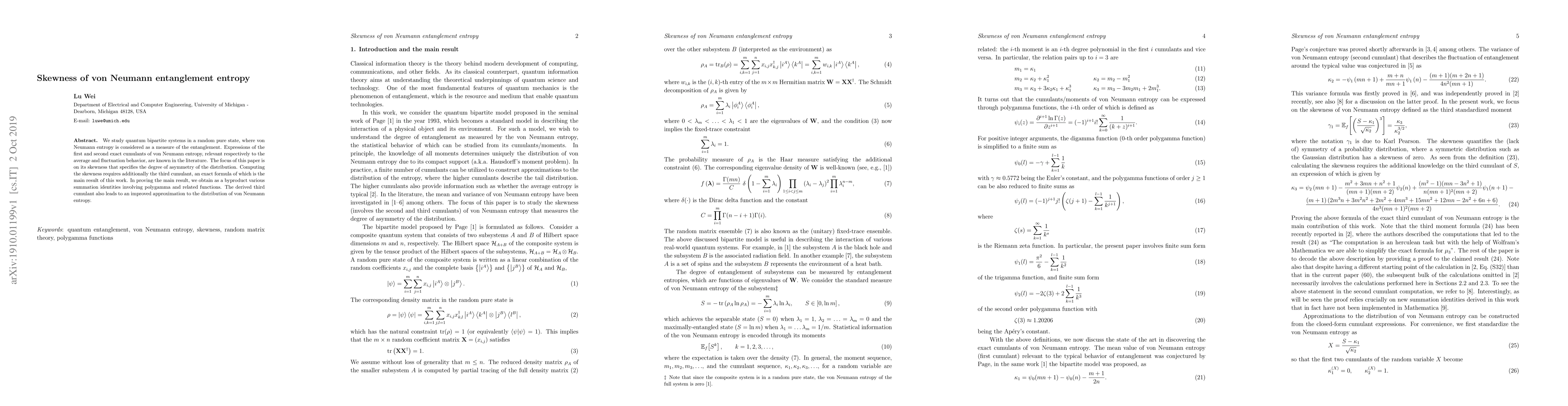 This paper derives an exact formula for the third cumulant of von Neumann entanglement entropy in quantum bipartite systems, which is crucial for computing skewness and thus quantifying the asymmetry of the distribution. The study also provides improved approximations for the distribution of von Neumann entropy.