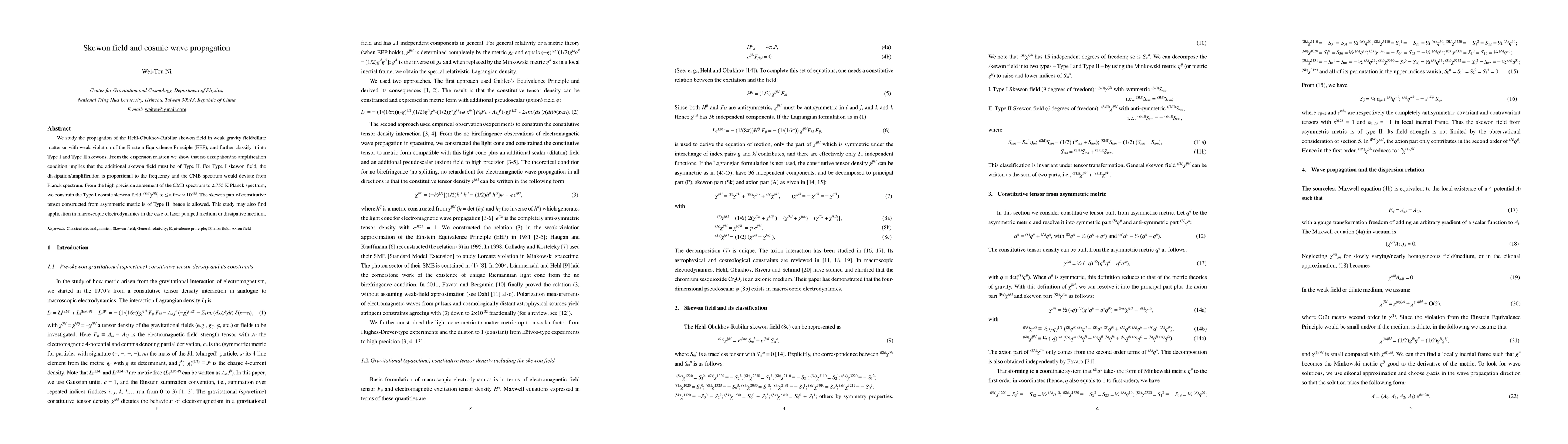 For the study of the gravitational coupling of electromagnetism and the equivalence principle, we have used the spacetime constitutive tensor density {chi}ijkl, and discovered the nonmetric (axion) part (A){chi}ijkl (equal to {phi}eijkl) of {chi}ijkl worthy investigation. Since we have used Lagrangian formalism, {chi}ijkl is effectively symmetric under the interchange of index pairs, ij and kl, and has 21 independent degrees of freedom. Hehl, Obukhov and Rubilar have started from charge-flux formalism to study electromagnetism, discovered the antisymmetric part (Sk){chi}ijkl (15 degrees of freedom) of {chi}ijkl under the interchange of index pairs ij and kl worthy investigation, and called it skewon field. In this paper, we study the propagation of the Hehl-Obukhov-Rubilar skewon field in weak gravity field/dilute matter or with weak violation of the Einstein Equivalence Principle (EEP), and further classify it into Type I and Type II skewons. From the dispersion relation we show that no dissipation/no amplification condition implies that the additional skewon field must be of Type II. For Type I skewon field, the dissipation/amplification is proportional to the frequency and the CMB spectrum would deviate from Planck spectrum. From the high precision agreement of the CMB spectrum to 2.755 K Planck spectrum, we constrain the Type I cosmic skewon field (SkI){chi}ijkl to less than a few x 10-35. The skewon part of constitutive tensor constructed from asymmetric metric is of Type II, hence is allowed. This study may also find applications in macroscopic electrodynamics in the case of laser pumped medium or dissipative medium.
