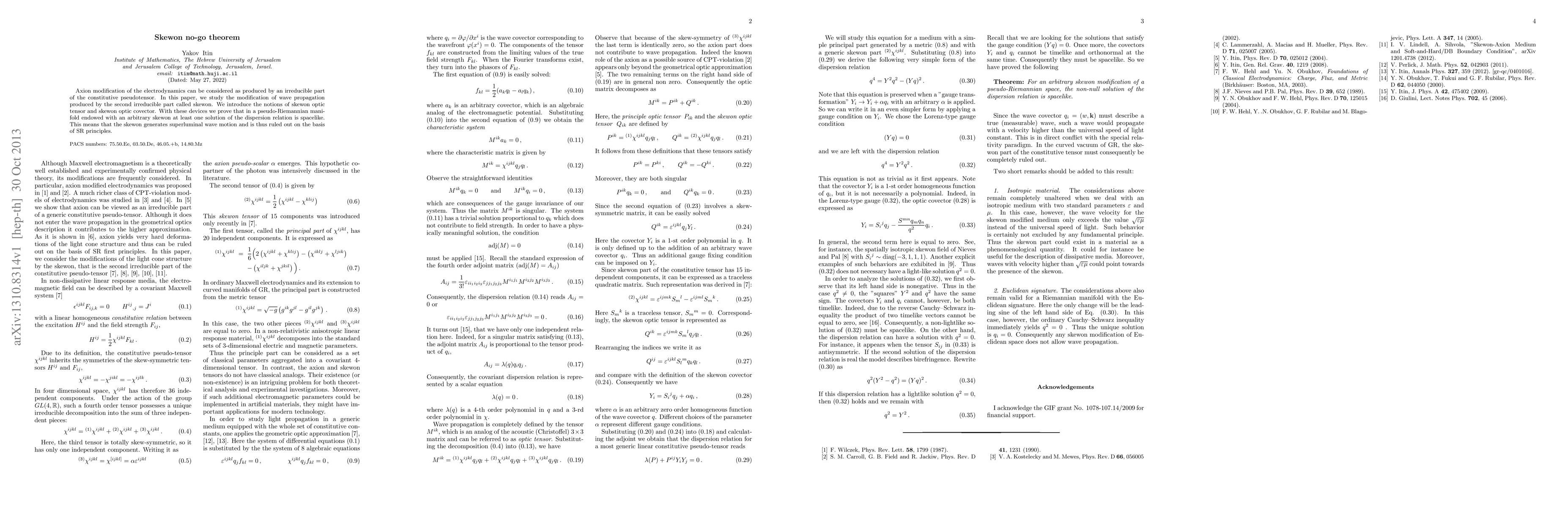 The paper proves that the presence of a skewon in a pseudo-Riemannian manifold leads to superluminal wave propagation, violating special relativity principles, thereby establishing a skewon no-go theorem.