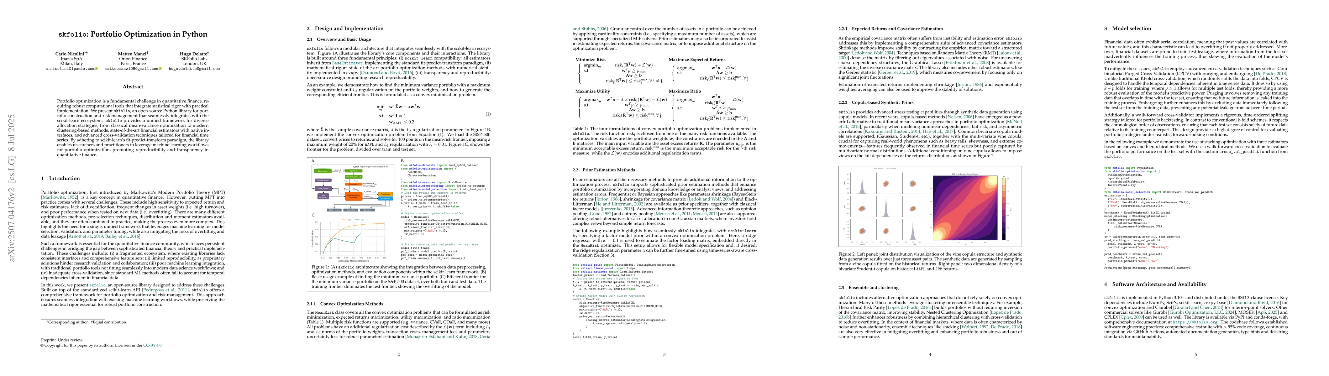 Portfolio optimization is a fundamental challenge in quantitative finance, requiring robust computational tools that integrate statistical rigor with practical implementation. We present skfolio, an open-source Python library for portfolio construction and risk management that seamlessly integrates with the scikit-learn ecosystem. skfolio provides a unified framework for diverse allocation strategies, from classical mean-variance optimization to modern clustering-based methods, state-of-the-art financial estimators with native interfaces, and advanced cross-validation techniques tailored for financial time series. By adhering to scikit-learn's fit-predict-transform paradigm, the library enables researchers and practitioners to leverage machine learning workflows for portfolio optimization, promoting reproducibility and transparency in quantitative finance.