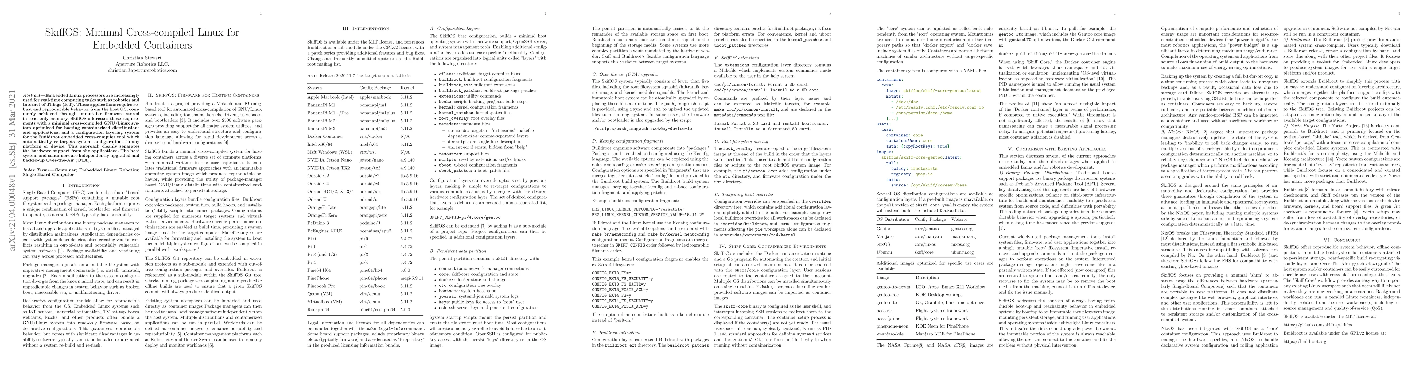 SkiffOS provides a minimal, cross-compiled Linux system optimized for embedded containers, enabling robust and reproducible behavior for real-time tasks like robotics and IoT. It features a configuration layering system for automatic platform re-targeting and supports independent OTA upgrades for the host system and containers.