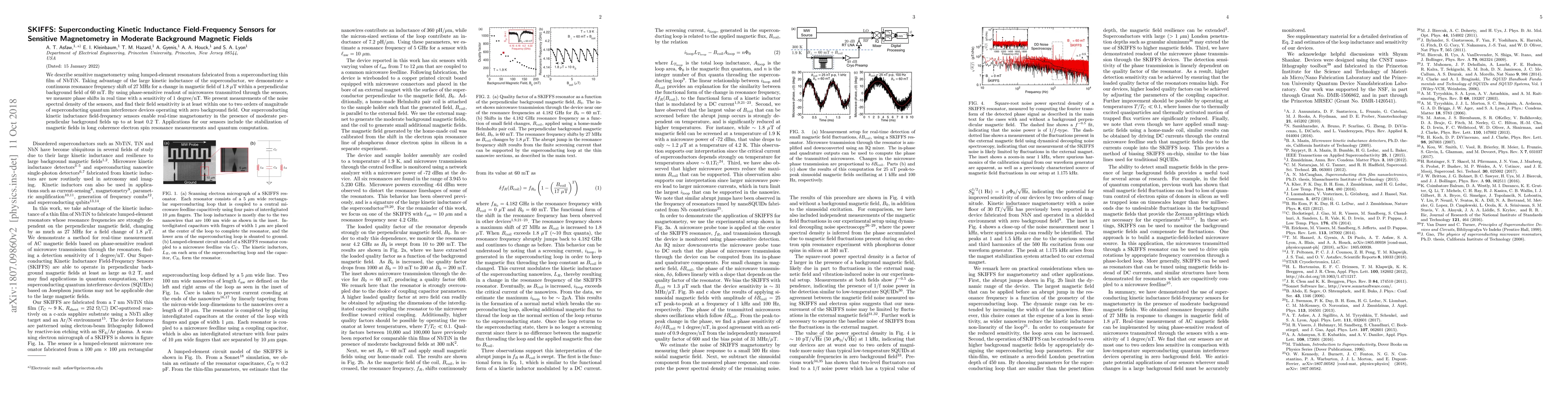 This paper introduces superconducting kinetic inductance field-frequency sensors (SKIFFS) for sensitive magnetometry, demonstrating a frequency shift of 27 MHz for a 1.8 μT magnetic field change in a 60 mT background field. The sensors achieve real-time phase shift measurements with a sensitivity of 1 degree/nT, comparable to superconducting quantum interference devices.