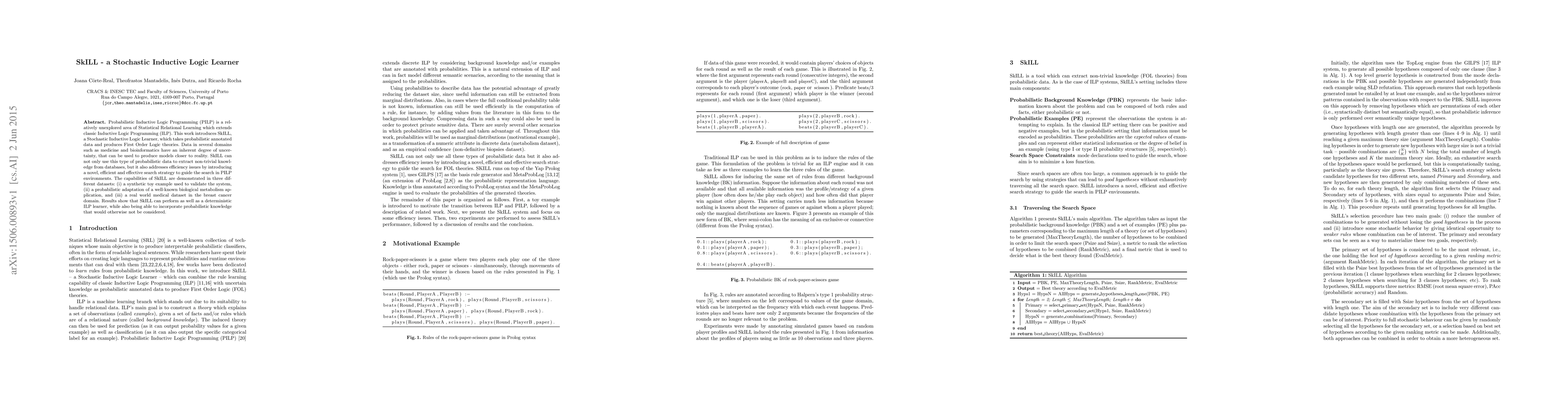 SkILL is a Stochastic Inductive Logic Learner designed for Probabilistic Inductive Logic Programming, enabling the extraction of First Order Logic theories from probabilistic data. It demonstrates effectiveness in various domains, including synthetic, biological, and medical datasets, showing comparable performance to deterministic ILP learners while incorporating probabilistic knowledge.
