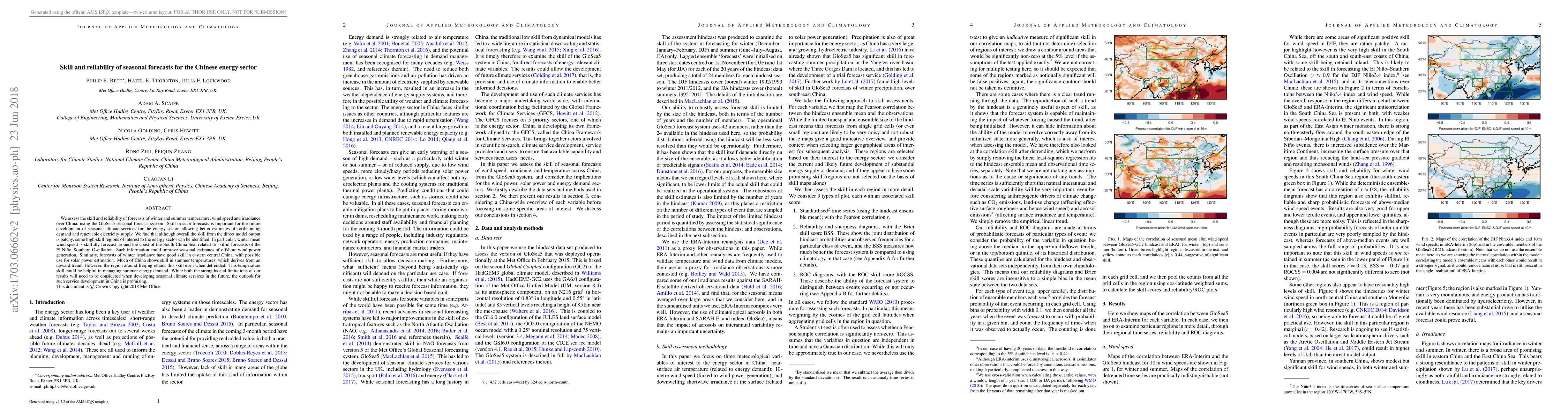 This study evaluates the skill and reliability of seasonal forecasts for China's energy sector using the GloSea5 system, finding high-skill regions for winter wind speed and irradiance, and summer temperatures, which could enhance renewable energy and demand management. Despite overall patchy skill, the potential for developing seasonal climate services is promising.