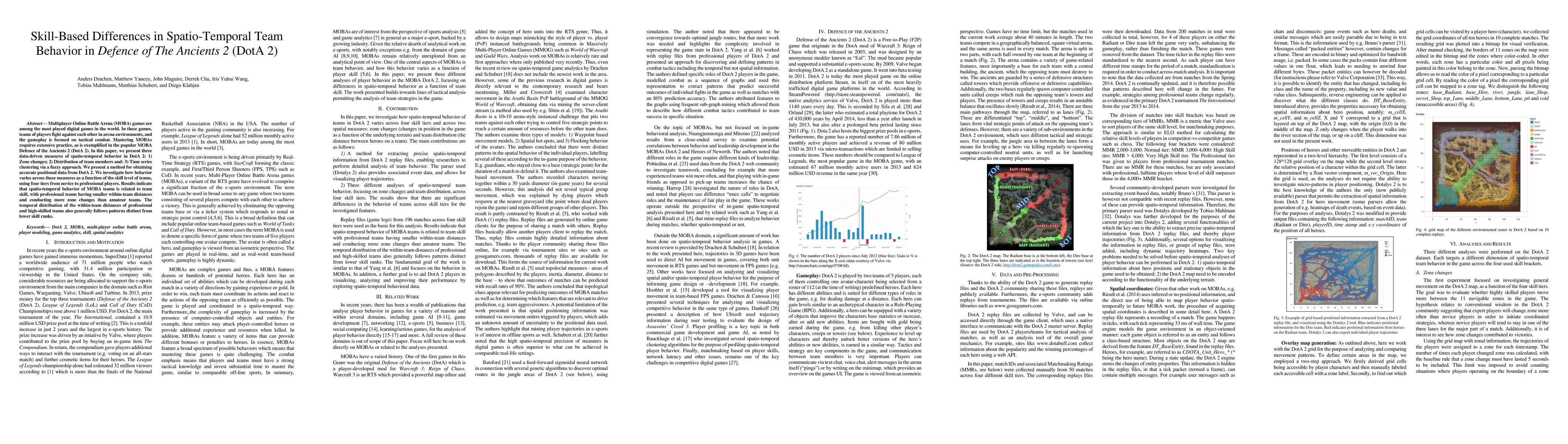This paper explores how skill levels in MOBA games like DotA 2 correlate with team members' spatio-temporal behavior, revealing that professional teams exhibit closer within-team distances and more frequent zone changes compared to novice teams. The study employs data-driven measures and fuzzy time series clustering to analyze these differences.