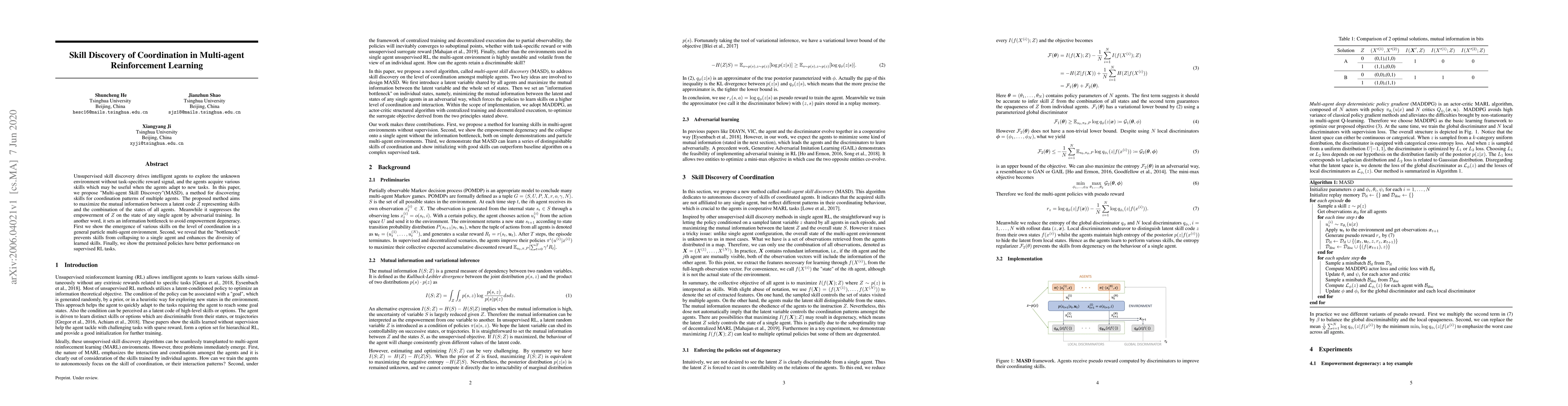 This paper proposes "Multi-agent Skill Discovery" (MASD) to autonomously discover coordination skills in multi-agent reinforcement learning environments without task-specific rewards. The method maximizes mutual information between latent skill codes and combined agent states while preventing any single agent's state from overpowering the skill representation, thus enhancing skill diversity and improving performance on supervised RL tasks.
