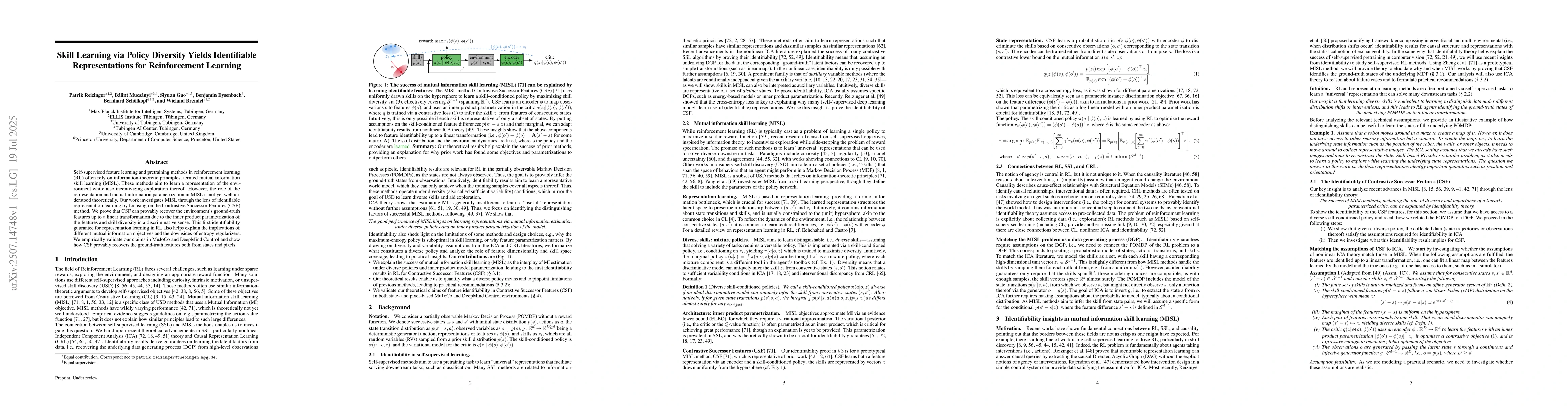 Self-supervised feature learning and pretraining methods in reinforcement learning (RL) often rely on information-theoretic principles, termed mutual information skill learning (MISL). These methods aim to learn a representation of the environment while also incentivizing exploration thereof. However, the role of the representation and mutual information parametrization in MISL is not yet well understood theoretically. Our work investigates MISL through the lens of identifiable representation learning by focusing on the Contrastive Successor Features (CSF) method. We prove that CSF can provably recover the environment's ground-truth features up to a linear transformation due to the inner product parametrization of the features and skill diversity in a discriminative sense. This first identifiability guarantee for representation learning in RL also helps explain the implications of different mutual information objectives and the downsides of entropy regularizers. We empirically validate our claims in MuJoCo and DeepMind Control and show how CSF provably recovers the ground-truth features both from states and pixels.