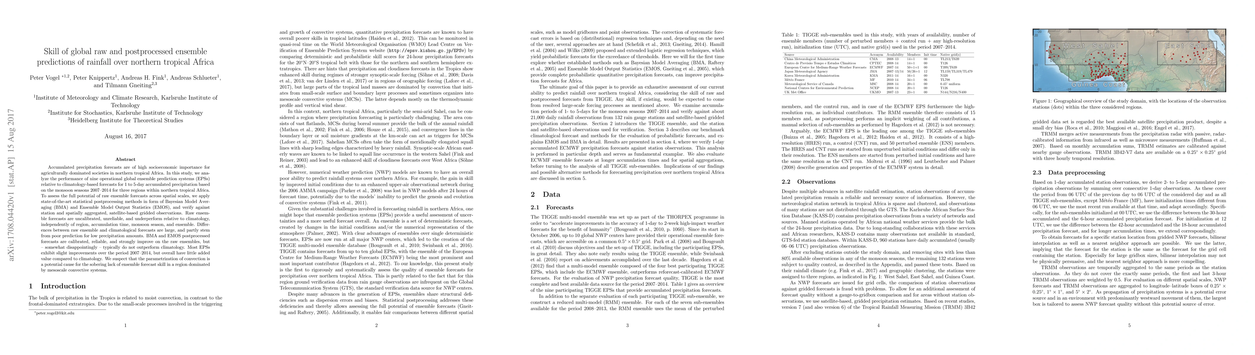 This study evaluates the skill of nine global ensemble prediction systems for 1 to 5-day accumulated rainfall forecasts over northern tropical Africa, finding that raw forecasts are uncalibrated and unreliable. Postprocessed forecasts using BMA and EMOS improve calibration and reliability but generally do not outperform climatology.