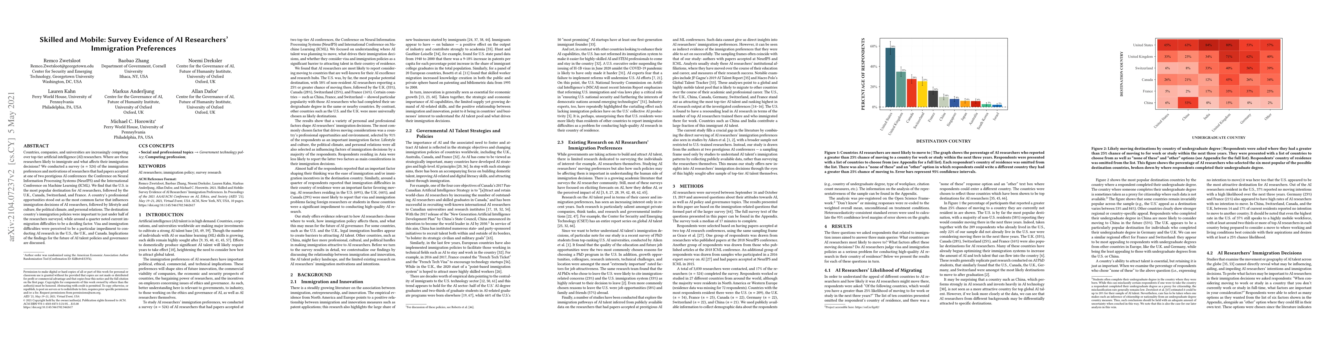 This survey of AI researchers $(n = 524)$ reveals that the U.S. is the top destination for immigration, followed by the U.K., Canada, Switzerland, and France, with professional opportunities being the primary influencing factor. Immigration policies and difficulties, particularly for the U.S., U.K., and Canada, also play a significant role in researchers' decisions.