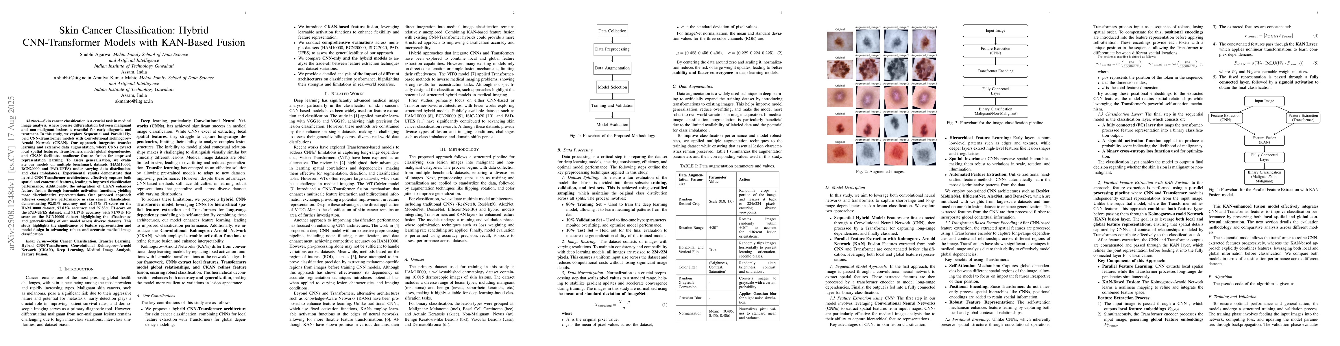 Skin cancer classification is a crucial task in medical image analysis, where precise differentiation between malignant and non-malignant lesions is essential for early diagnosis and treatment. In this study, we explore Sequential and Parallel Hybrid CNN-Transformer models with Convolutional Kolmogorov-Arnold Network (CKAN). Our approach integrates transfer learning and extensive data augmentation, where CNNs extract local spatial features, Transformers model global dependencies, and CKAN facilitates nonlinear feature fusion for improved representation learning. To assess generalization, we evaluate our models on multiple benchmark datasets (HAM10000,BCN20000 and PAD-UFES) under varying data distributions and class imbalances. Experimental results demonstrate that hybrid CNN-Transformer architectures effectively capture both spatial and contextual features, leading to improved classification performance. Additionally, the integration of CKAN enhances feature fusion through learnable activation functions, yielding more discriminative representations. Our proposed approach achieves competitive performance in skin cancer classification, demonstrating 92.81% accuracy and 92.47% F1-score on the HAM10000 dataset, 97.83% accuracy and 97.83% F1-score on the PAD-UFES dataset, and 91.17% accuracy with 91.79% F1- score on the BCN20000 dataset highlighting the effectiveness and generalizability of our model across diverse datasets. This study highlights the significance of feature representation and model design in advancing robust and accurate medical image classification.
