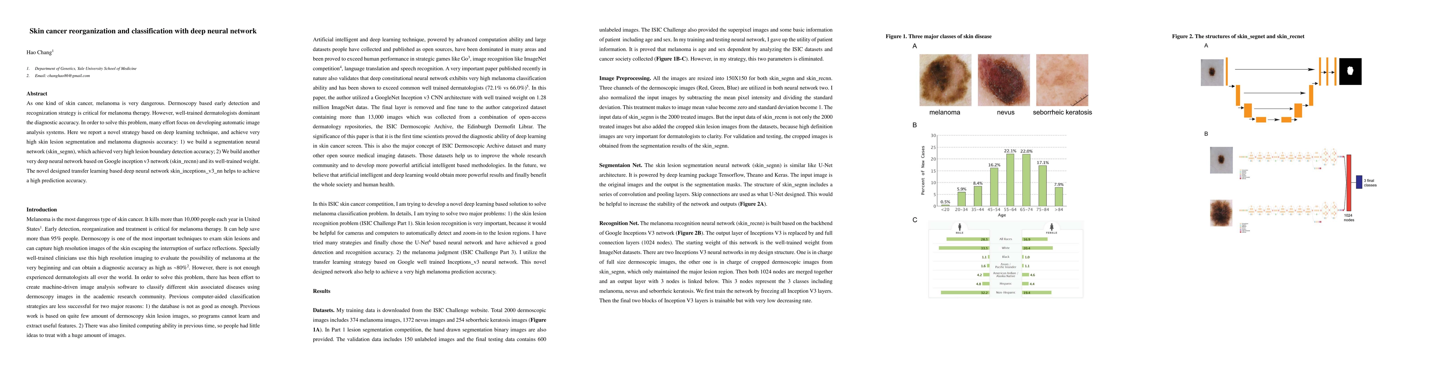As one kind of skin cancer, melanoma is very dangerous. Dermoscopy based early detection and recarbonization strategy is critical for melanoma therapy. However, well-trained dermatologists dominant the diagnostic accuracy. In order to solve this problem, many effort focus on developing automatic image analysis systems. Here we report a novel strategy based on deep learning technique, and achieve very high skin lesion segmentation and melanoma diagnosis accuracy: 1) we build a segmentation neural network (skin_segnn), which achieved very high lesion boundary detection accuracy; 2) We build another very deep neural network based on Google inception v3 network (skin_recnn) and its well-trained weight. The novel designed transfer learning based deep neural network skin_inceptions_v3_nn helps to achieve a high prediction accuracy.