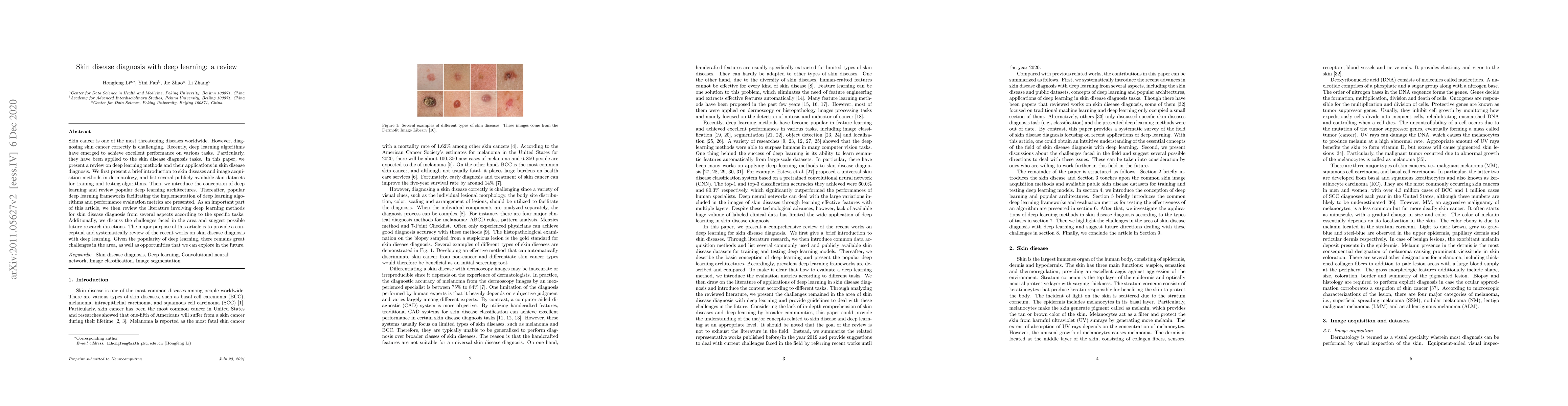 Skin cancer is one of the most threatening diseases worldwide. However, diagnosing skin cancer correctly is challenging. Recently, deep learning algorithms have emerged to achieve excellent performance on various tasks. Particularly, they have been applied to the skin disease diagnosis tasks. In this paper, we present a review on deep learning methods and their applications in skin disease diagnosis. We first present a brief introduction to skin diseases and image acquisition methods in dermatology, and list several publicly available skin datasets for training and testing algorithms. Then, we introduce the conception of deep learning and review popular deep learning architectures. Thereafter, popular deep learning frameworks facilitating the implementation of deep learning algorithms and performance evaluation metrics are presented. As an important part of this article, we then review the literature involving deep learning methods for skin disease diagnosis from several aspects according to the specific tasks. Additionally, we discuss the challenges faced in the area and suggest possible future research directions. The major purpose of this article is to provide a conceptual and systematically review of the recent works on skin disease diagnosis with deep learning. Given the popularity of deep learning, there remains great challenges in the area, as well as opportunities that we can explore in the future.