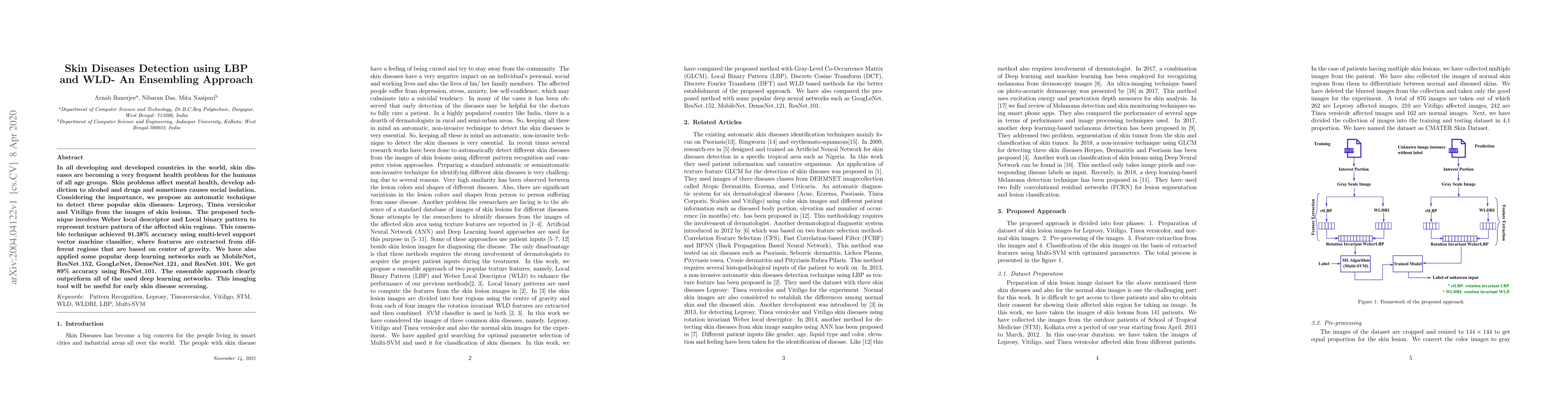 In all developing and developed countries in the world, skin diseases are becoming a very frequent health problem for the humans of all age groups. Skin problems affect mental health, develop addiction to alcohol and drugs and sometimes causes social isolation. Considering the importance, we propose an automatic technique to detect three popular skin diseases- Leprosy, Tinea versicolor and Vitiligofrom the images of skin lesions. The proposed technique involves Weber local descriptor and Local binary pattern to represent texture pattern of the affected skin regions. This ensemble technique achieved 91.38% accuracy using multi-level support vector machine classifier, where features are extracted from different regions that are based on center of gravity. We have also applied some popular deep learn-ing networks such as MobileNet, ResNet_152, GoogLeNet,DenseNet_121, and ResNet_101. We get 89% accuracy using ResNet_101. The ensemble approach clearly outperform all of the used deep learning networks. This imaging tool will be useful for early skin disease screening.