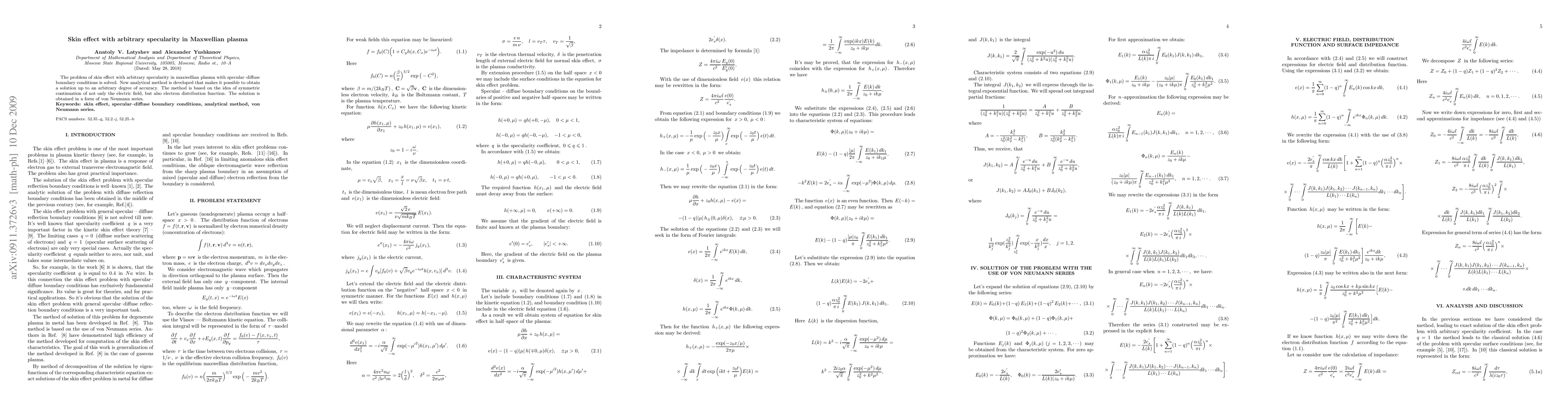 The problem of skin effect with arbitrary specularity in maxwellian plasma with specular--diffuse boundary conditions is solved. A new analytical method is developed that makes it possible to to obtain a solution up to an arbitrary degree of accuracy. The method is based on the idea of symmetric continuation not only the electric field, but also electron distribution function. The solution is obtained in a form of von Neumann series.