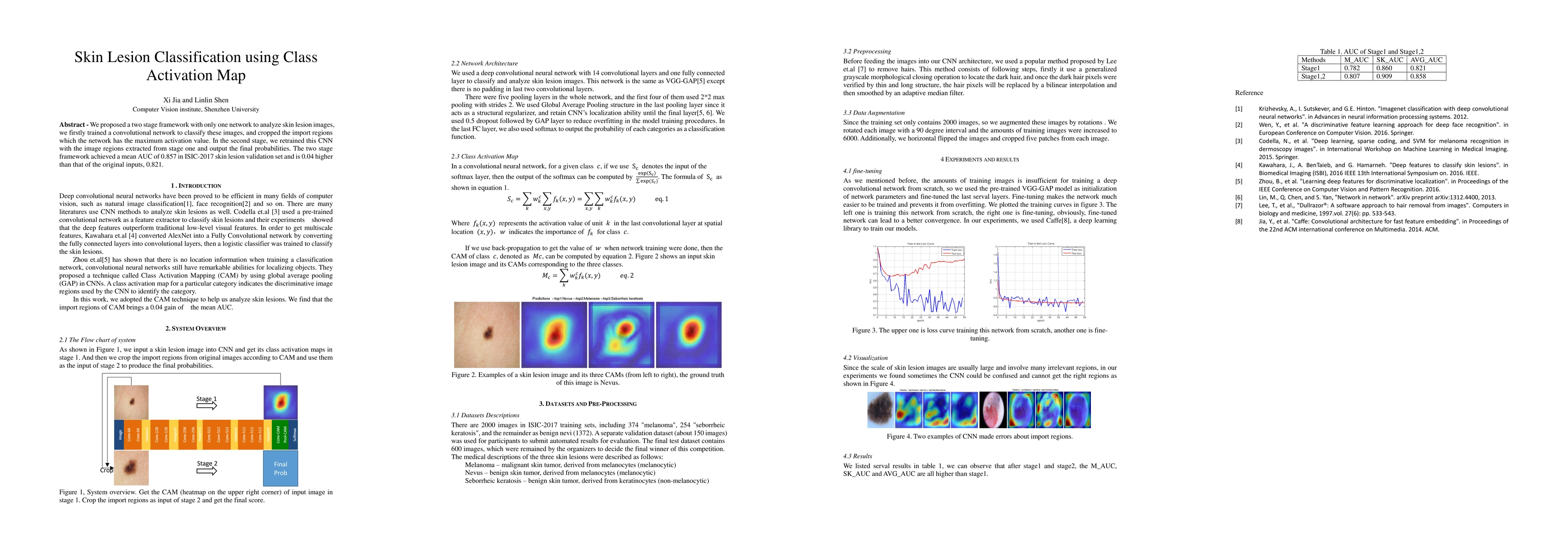 We proposed a two stage framework with only one network to analyze skin lesion images, we firstly trained a convolutional network to classify these images, and cropped the import regions which the network has the maximum activation value. In the second stage, we retrained this CNN with the image regions extracted from stage one and output the final probabilities. The two stage framework achieved a mean AUC of 0.857 in ISIC-2017 skin lesion validation set and is 0.04 higher than that of the original inputs, 0.821.