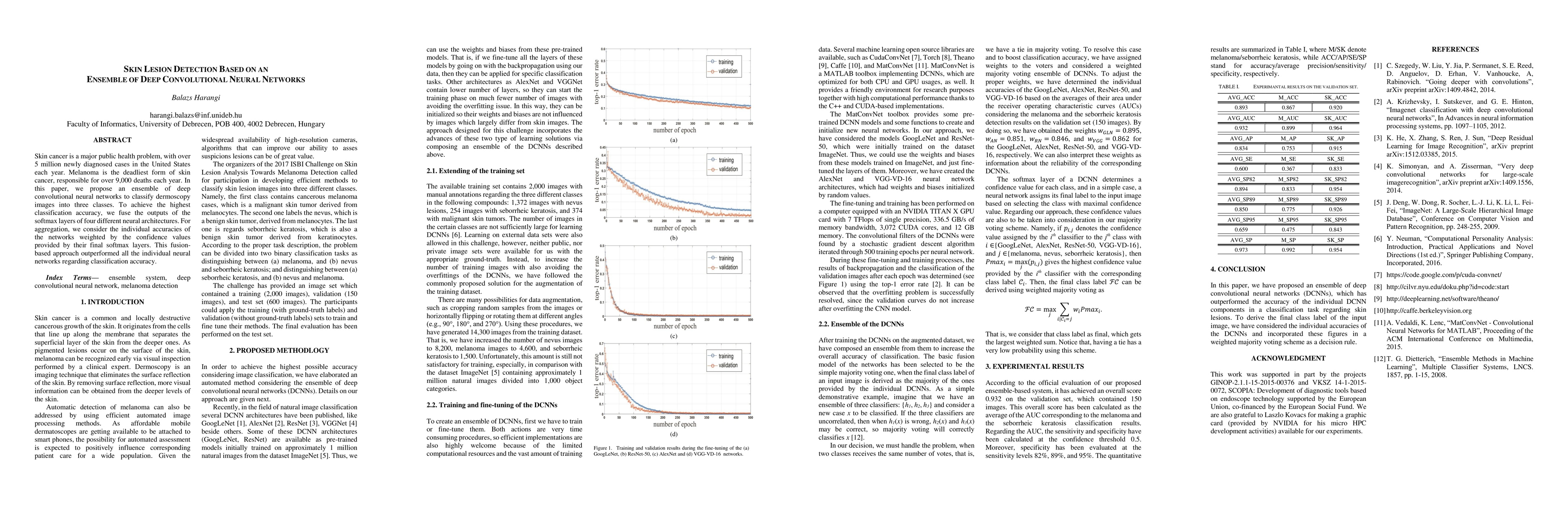 Skin cancer is a major public health problem, with over 5 million newly diagnosed cases in the United States each year. Melanoma is the deadliest form of skin cancer, responsible for over 9,000 deaths each year. In this paper, we propose an ensemble of deep convolutional neural networks to classify dermoscopy images into three classes. To achieve the highest classification accuracy, we fuse the outputs of the softmax layers of four different neural architectures. For aggregation, we consider the individual accuracies of the networks weighted by the confidence values provided by their final softmax layers. This fusion-based approach outperformed all the individual neural networks regarding classification accuracy.