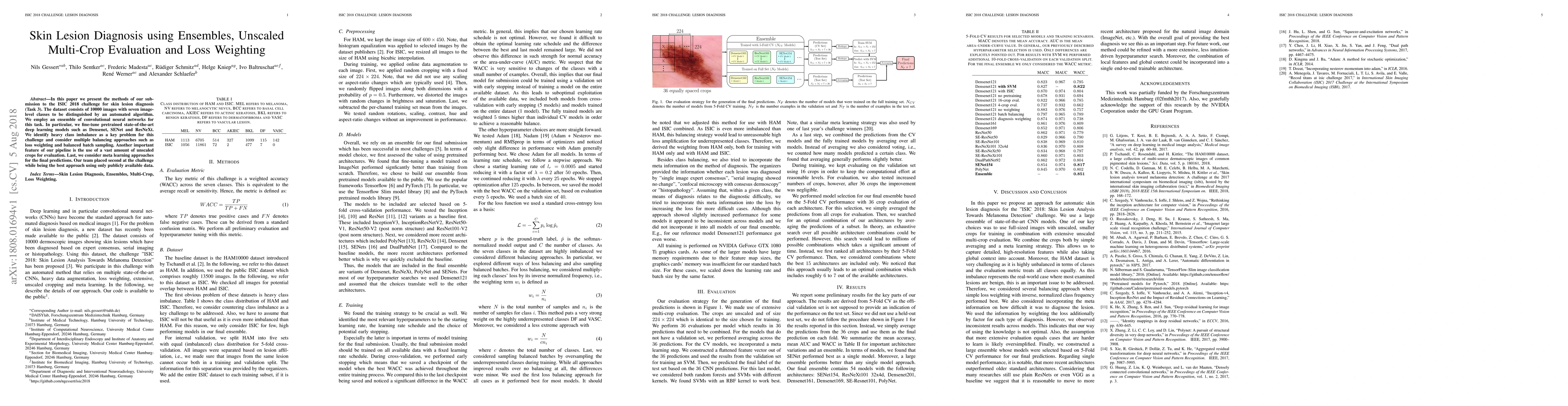 This paper describes an ensemble of fine-tuned convolutional neural networks, including Densenet, SENet, and ResNeXt, for diagnosing skin lesions from a dataset of 10,000 images. The authors address class imbalance through loss weighting and balanced batch sampling, and utilize unscaled multi-crop evaluation for improved accuracy, achieving second place in the ISIC 2018 challenge.
