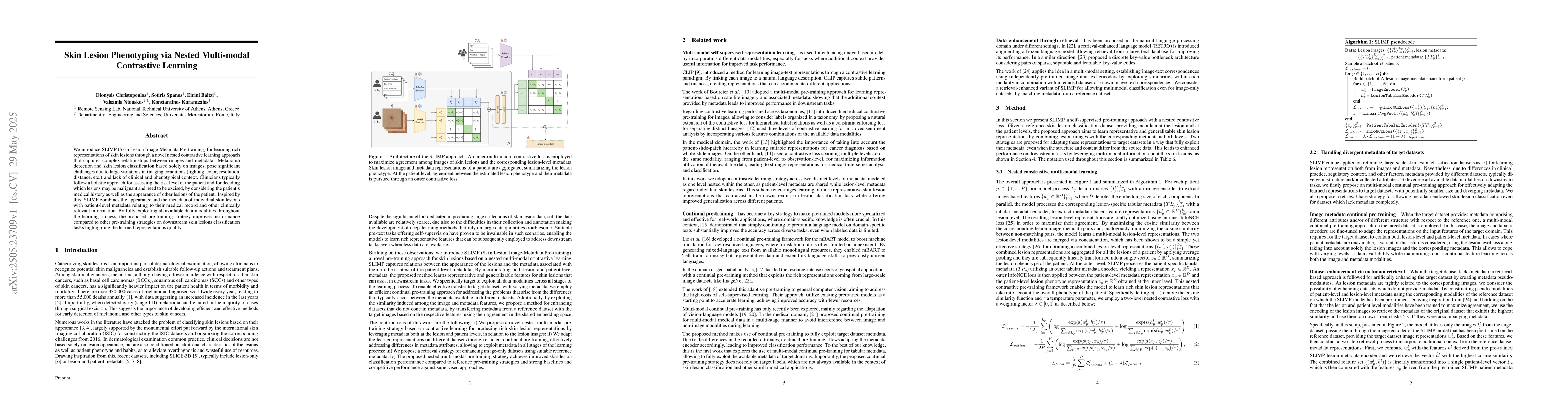 The paper presents SLIMP, a nested multi-modal contrastive learning approach for skin lesion phenotyping that effectively combines image and metadata representations, improving downstream classification performance.