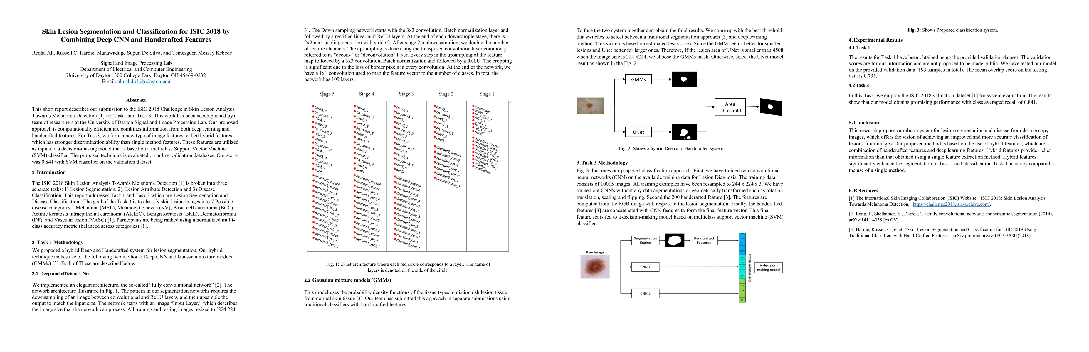 This research paper by the University of Dayton Signal and Image Processing Lab presents a method combining deep convolutional neural networks (CNN) with handcrafted features for skin lesion segmentation and classification in the ISIC 2018 Challenge. The proposed hybrid features, which integrate both deep learning and handcrafted information, are used as inputs to a multiclass SVM classifier, achieving a score of 0.841 on the validation dataset.
