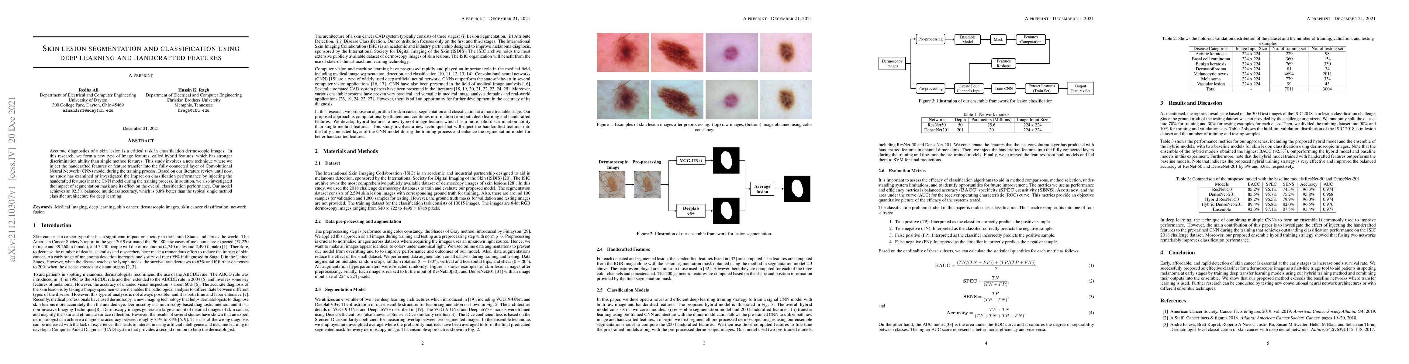 This paper proposes a hybrid feature approach combining handcrafted features with deep learning for skin lesion segmentation and classification in dermoscopic images. The study introduces a novel technique of injecting handcrafted features into a CNN model during training, achieving a 92.3% balanced multiclass accuracy, outperforming typical deep learning classifiers by 6.8%.