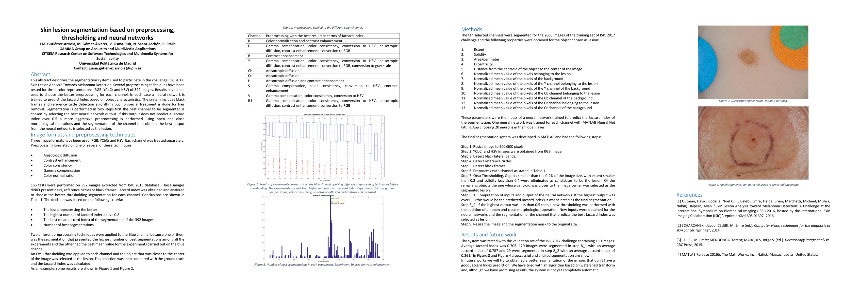This abstract describes the segmentation system used to participate in the challenge ISIC 2017: Skin Lesion Analysis Towards Melanoma Detection. Several preprocessing techniques have been tested for three color representations (RGB, YCbCr and HSV) of 392 images. Results have been used to choose the better preprocessing for each channel. In each case a neural network is trained to predict the Jaccard Index based on object characteristics. The system includes black frames and reference circle detection algorithms but no special treatment is done for hair removal. Segmentation is performed in two steps first the best channel to be segmented is chosen by selecting the best neural network output. If this output does not predict a Jaccard Index over 0.5 a more aggressive preprocessing is performed using open and close morphological operations and the segmentation of the channel that obtains the best output from the neural networks is selected as the lesion.