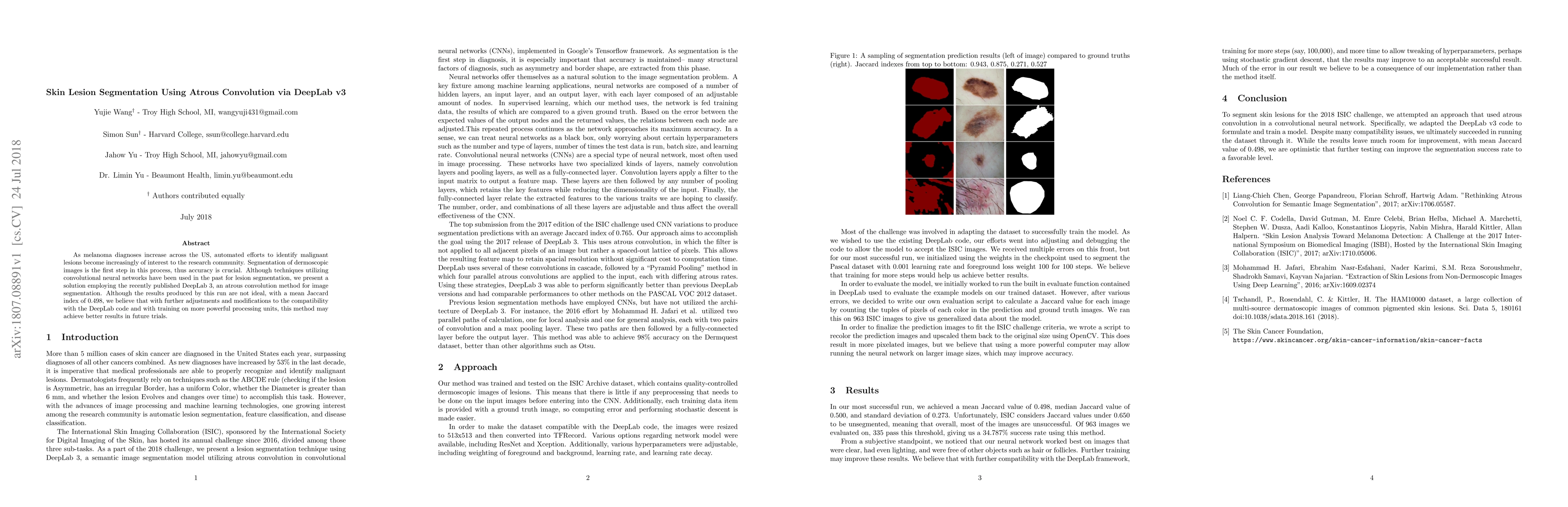 As melanoma diagnoses increase across the US, automated efforts to identify malignant lesions become increasingly of interest to the research community. Segmentation of dermoscopic images is the first step in this process, thus accuracy is crucial. Although techniques utilizing convolutional neural networks have been used in the past for lesion segmentation, we present a solution employing the recently published DeepLab 3, an atrous convolution method for image segmentation. Although the results produced by this run are not ideal, with a mean Jaccard index of 0.498, we believe that with further adjustments and modifications to the compatibility with the DeepLab code and with training on more powerful processing units, this method may achieve better results in future trials.