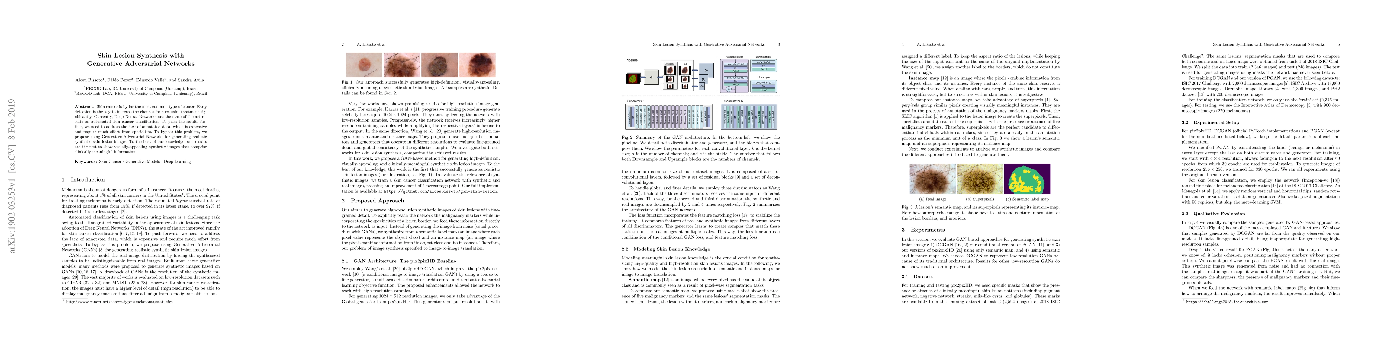 Skin cancer is by far the most common type of cancer. Early detection is the key to increase the chances for successful treatment significantly. Currently, Deep Neural Networks are the state-of-the-art results on automated skin cancer classification. To push the results further, we need to address the lack of annotated data, which is expensive and require much effort from specialists. To bypass this problem, we propose using Generative Adversarial Networks for generating realistic synthetic skin lesion images. To the best of our knowledge, our results are the first to show visually-appealing synthetic images that comprise clinically-meaningful information.