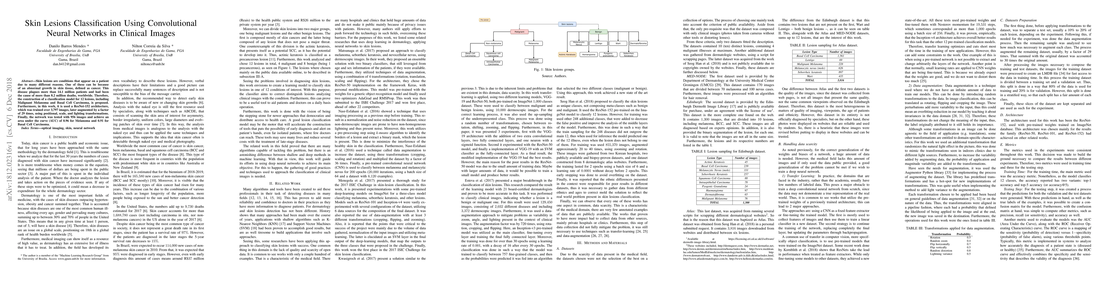 This paper proposes a classification model using a ResNet-152 convolutional neural network to categorize 12 skin lesions, including Malignant Melanoma and Basal Cell Carcinoma, trained on 3,797 images augmented to 107,333. The model achieves an AUC of 0.96 for Melanoma and 0.91 for Basal Cell Carcinoma.
