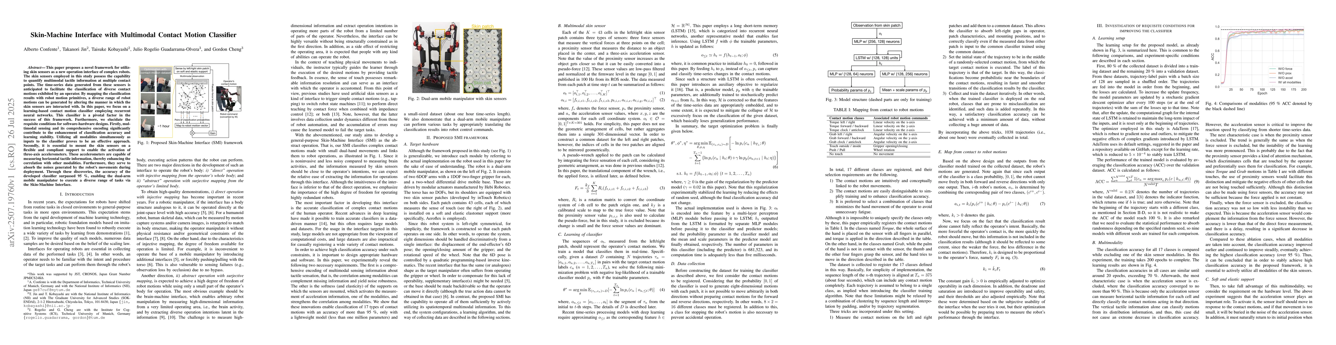 This paper proposes a novel framework for utilizing skin sensors as a new operation interface of complex robots. The skin sensors employed in this study possess the capability to quantify multimodal tactile information at multiple contact points. The time-series data generated from these sensors is anticipated to facilitate the classification of diverse contact motions exhibited by an operator. By mapping the classification results with robot motion primitives, a diverse range of robot motions can be generated by altering the manner in which the skin sensors are interacted with. In this paper, we focus on a learning-based contact motion classifier employing recurrent neural networks. This classifier is a pivotal factor in the success of this framework. Furthermore, we elucidate the requisite conditions for software-hardware designs. Firstly, multimodal sensing and its comprehensive encoding significantly contribute to the enhancement of classification accuracy and learning stability. Utilizing all modalities simultaneously as inputs to the classifier proves to be an effective approach. Secondly, it is essential to mount the skin sensors on a flexible and compliant support to enable the activation of three-axis accelerometers. These accelerometers are capable of measuring horizontal tactile information, thereby enhancing the correlation with other modalities. Furthermore, they serve to absorb the noises generated by the robot's movements during deployment. Through these discoveries, the accuracy of the developed classifier surpassed 95 %, enabling the dual-arm mobile manipulator to execute a diverse range of tasks via the Skin-Machine Interface. https://youtu.be/UjUXT4Z4BC8