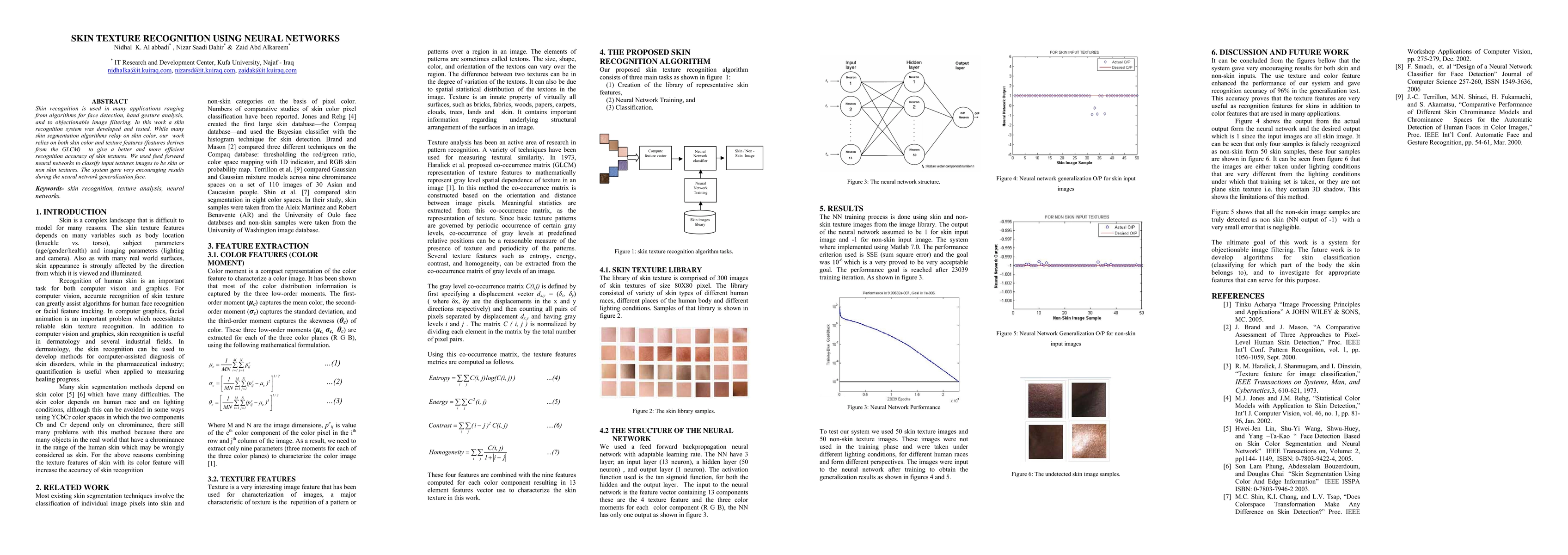 Researchers developed a skin recognition system using neural networks that combines skin color and texture features for improved accuracy. The system achieved encouraging results in classifying input textures as skin or non-skin.