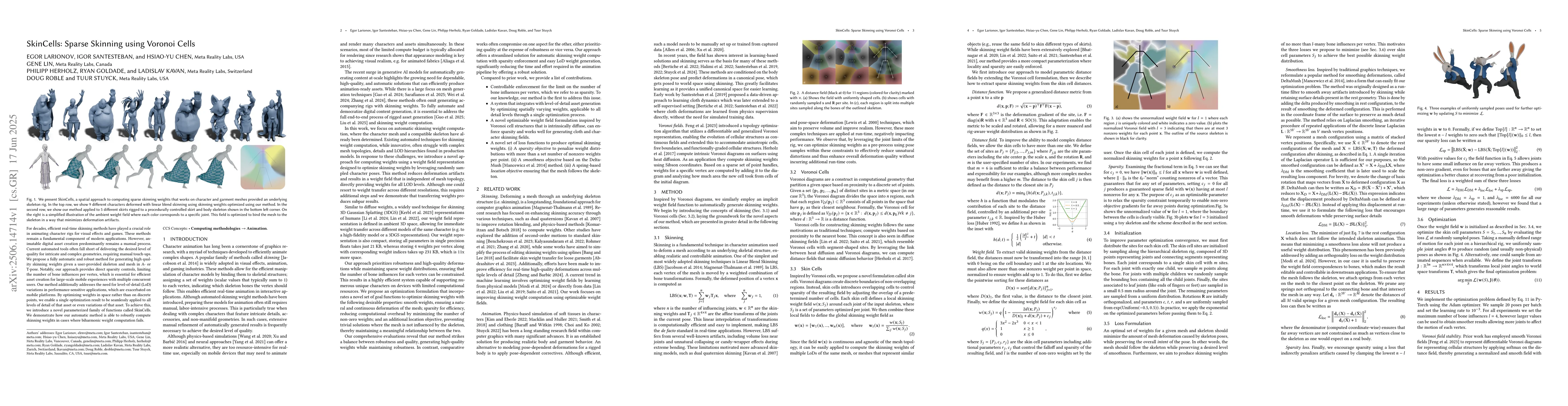 This paper introduces SkinCells, a novel method for automatic generation of high-quality skinning weights for character rigs in visual effects and games. It offers direct sparsity controls, enabling efficient asset creation for large-scale mobile experiences, and addresses level-of-detail variations for performance-sensitive applications.
