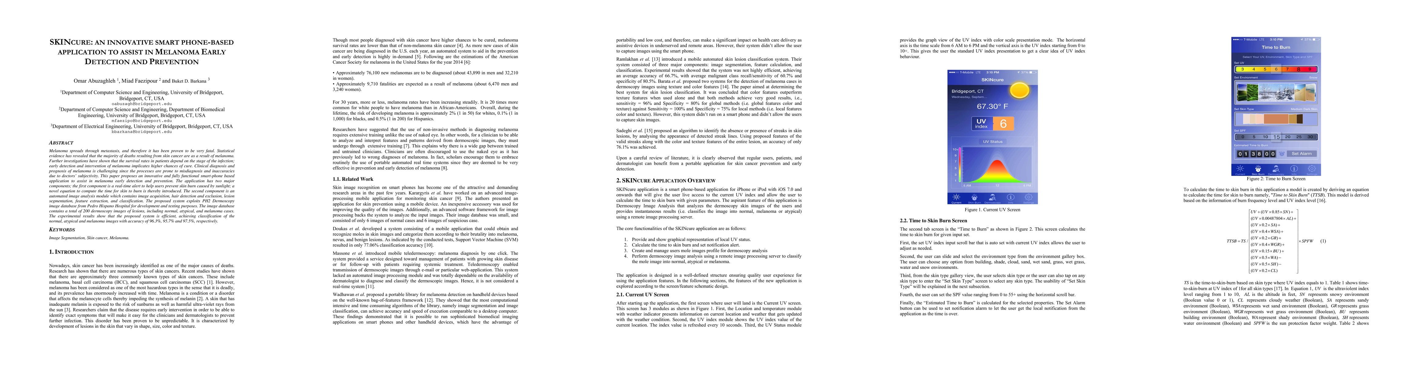 This paper proposes a smartphone application, Skincure, for early detection and prevention of melanoma, featuring real-time sun exposure alerts and an automated image analysis module for lesion detection and classification, achieving high accuracy rates in distinguishing normal, atypical, and melanoma cases.