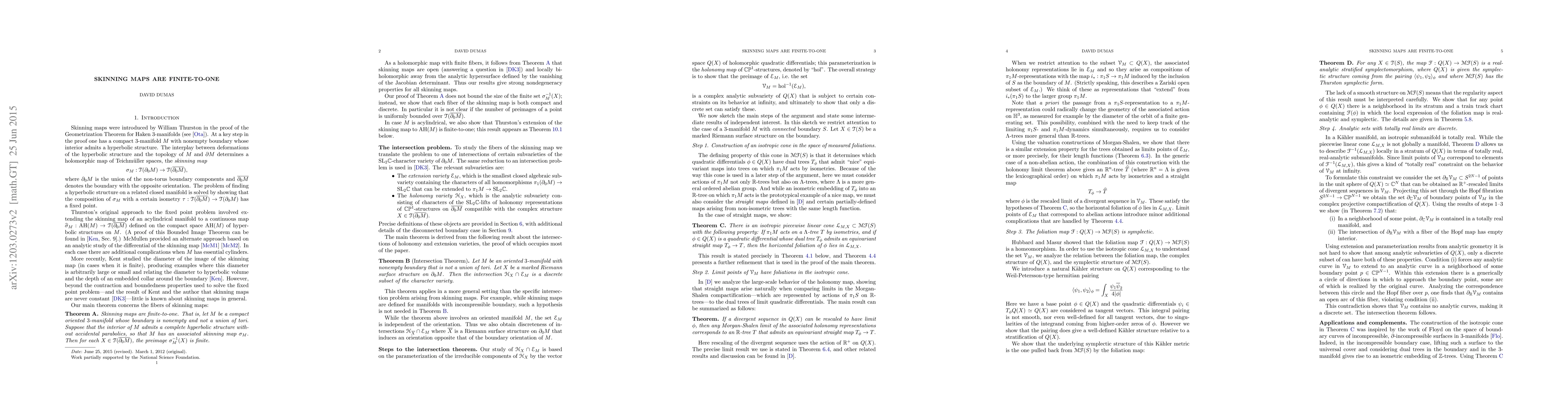 We show that Thurston's skinning maps of Teichmuller space have finite fibers. The proof centers around a study of two subvarieties of the SL_2(C) character variety of a surface, one associated to complex projective structures and the other associated to a 3-manifold. Using the Morgan-Shalen compactification of the character variety and the results of [arXiv:1105.5102] on holonomy limits of complex projective structures, we show that these subvarieties have only a discrete set of intersections. Along the way, we introduce a natural stratified Kahler metric on the space of holomorphic quadratic differentials on a Riemann surface and show that it is symplectomorphic to the space of measured foliations. Mirzakhani has used this symplectomorphism to show that the Hubbard-Masur function is constant; we include a proof of this result. We also generalize Floyd's theorem on the space of boundary curves of incompressible, boundary-incompressible surfaces to a statement about extending group actions on Lambda-trees.