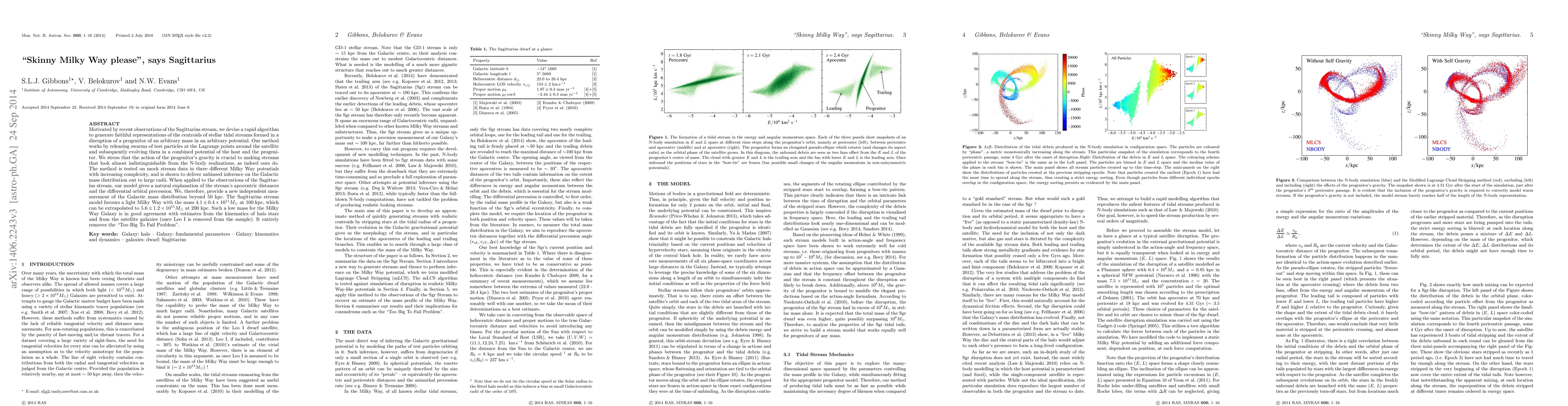 Motivated by recent observations of the Sagittarius stream, we devise a rapid algorithm to generate faithful representations of the centroids of stellar tidal streams formed in a disruption of a progenitor of an arbitrary mass in an arbitrary potential. Our method works by releasing swarms of test particles at the Lagrange points around the satellite and subsequently evolving them in a combined potential of the host and the progenitor. We stress that the action of the progenitor's gravity is crucial to making streams that look almost indistinguishable from the N-body realizations, as indeed ours do. The method is tested on mock stream data in three different Milky Way potentials with increasing complexity, and is shown to deliver unbiased inference on the Galactic mass distribution out to large radii. When applied to the observations of the Sagittarius stream, our model gives a natural explanation of the stream's apocentric distances and the differential orbital precession. We, therefore, provide a new independent measurement of the Galactic mass distribution beyond 50 kpc. The Sagittarius stream model favours a light Milky Way with the mass 4.1 +/- 0.4 x 10^11 M_sun at 100 kpc, which can be extrapolated to 5.6 +/- 1.2 x 10^11 M_sun at 200 kpc. Such a low mass for the Milky Way Galaxy is in good agreement with estimates from the kinematics of halo stars and from the satellite galaxies (once Leo I is removed from the sample). It entirely removes the "Too Big To Fail Problem".