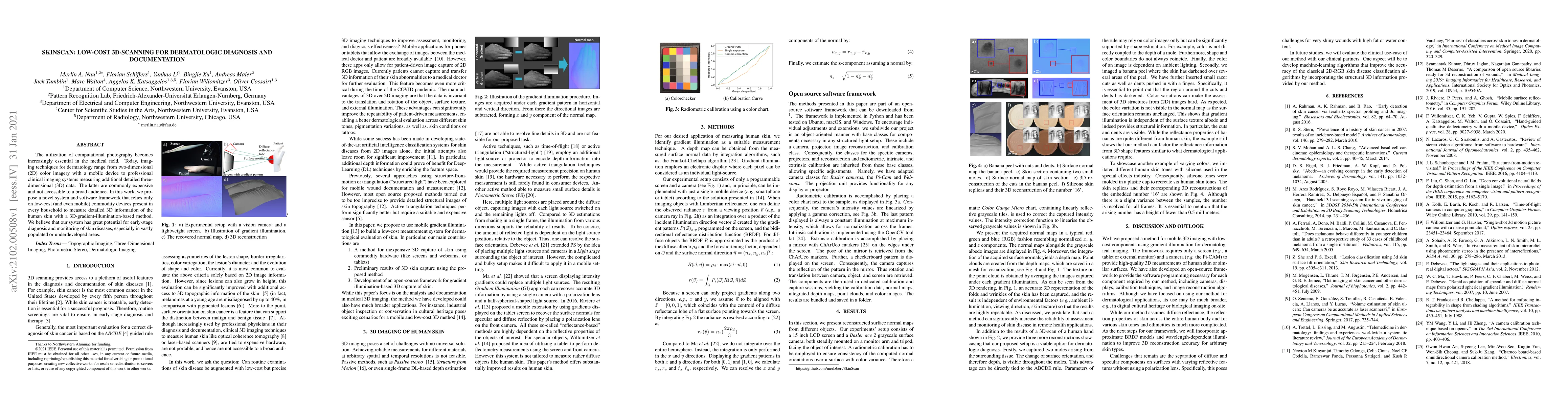 The utilization of computational photography becomes increasingly essential in the medical field. Today, imaging techniques for dermatology range from two-dimensional (2D) color imagery with a mobile device to professional clinical imaging systems measuring additional detailed three-dimensional (3D) data. The latter are commonly expensive and not accessible to a broad audience. In this work, we propose a novel system and software framework that relies only on low-cost (and even mobile) commodity devices present in every household to measure detailed 3D information of the human skin with a 3D-gradient-illumination-based method. We believe that our system has great potential for early-stage diagnosis and monitoring of skin diseases, especially in vastly populated or underdeveloped areas.