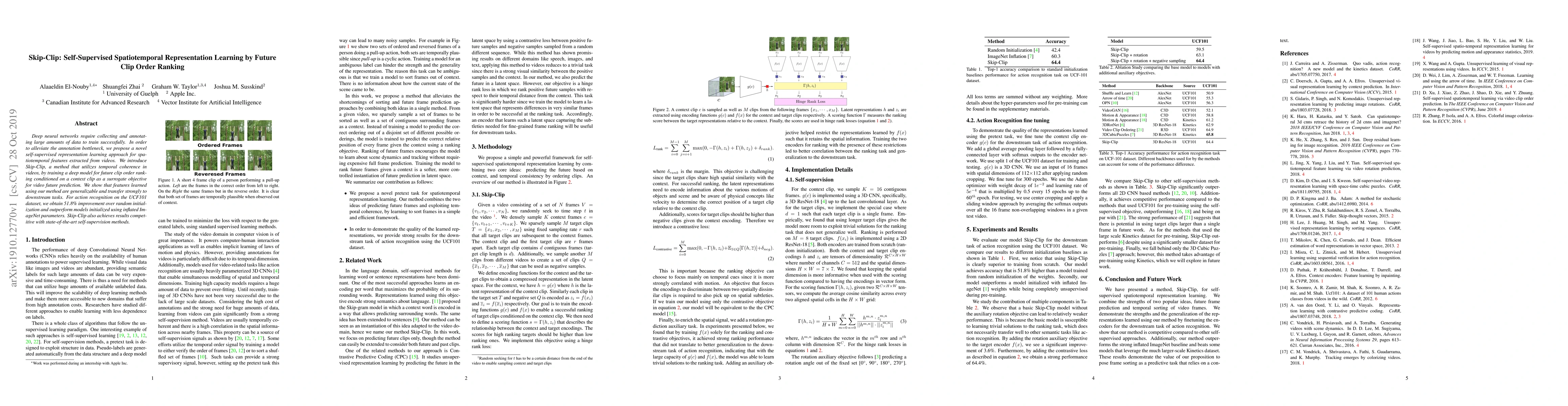 Skip-Clip proposes a self-supervised learning method for spatiotemporal video feature extraction by ranking future clip order based on context clips, reducing the need for large annotated datasets. This approach shows significant improvement in action recognition on UCF101, outperforming models with ImageNet initialization and achieving competitive results with leading self-supervised methods.