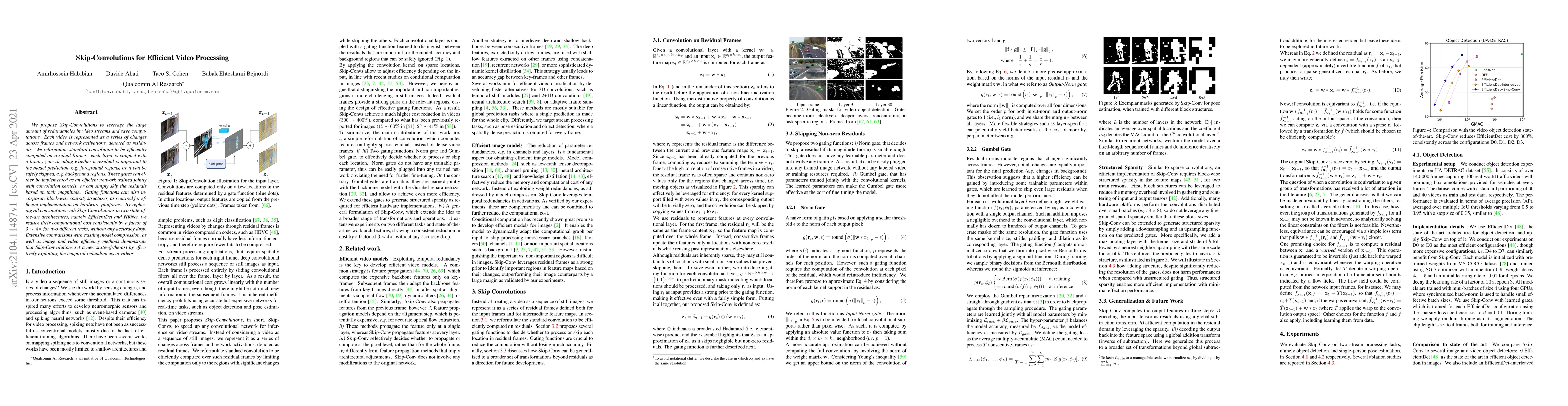 We propose Skip-Convolutions to leverage the large amount of redundancies in video streams and save computations. Each video is represented as a series of changes across frames and network activations, denoted as residuals. We reformulate standard convolution to be efficiently computed on residual frames: each layer is coupled with a binary gate deciding whether a residual is important to the model prediction,~\eg foreground regions, or it can be safely skipped, e.g. background regions. These gates can either be implemented as an efficient network trained jointly with convolution kernels, or can simply skip the residuals based on their magnitude. Gating functions can also incorporate block-wise sparsity structures, as required for efficient implementation on hardware platforms. By replacing all convolutions with Skip-Convolutions in two state-of-the-art architectures, namely EfficientDet and HRNet, we reduce their computational cost consistently by a factor of 3~4x for two different tasks, without any accuracy drop. Extensive comparisons with existing model compression, as well as image and video efficiency methods demonstrate that Skip-Convolutions set a new state-of-the-art by effectively exploiting the temporal redundancies in videos.