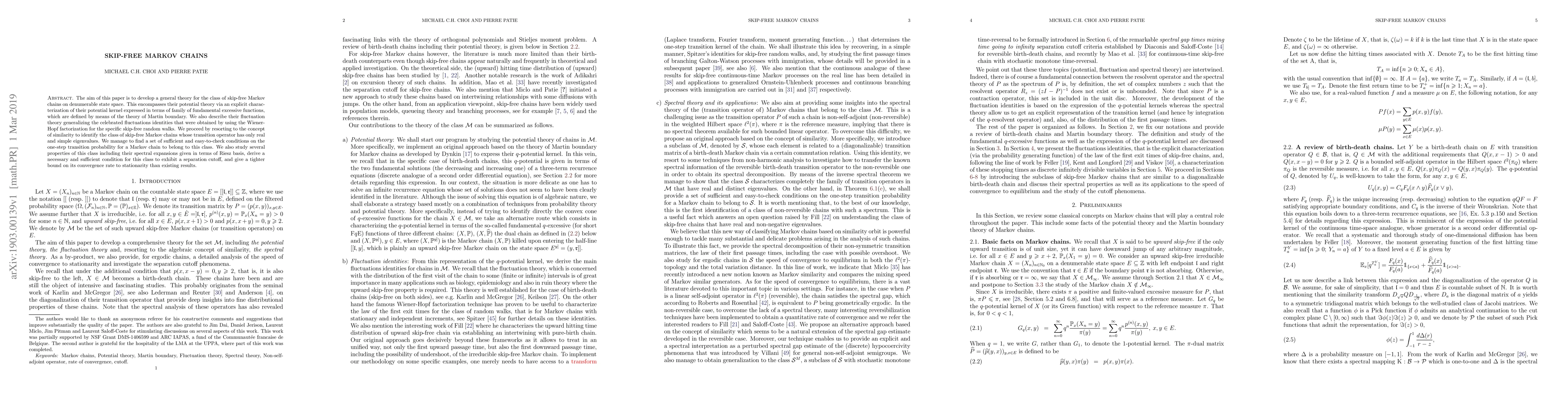 This paper develops a comprehensive theory for skip-free Markov chains on denumerable state spaces, including their potential and fluctuation theories. It identifies a class of these chains with real, simple eigenvalues, providing conditions for membership and studying their spectral properties and convergence rates.