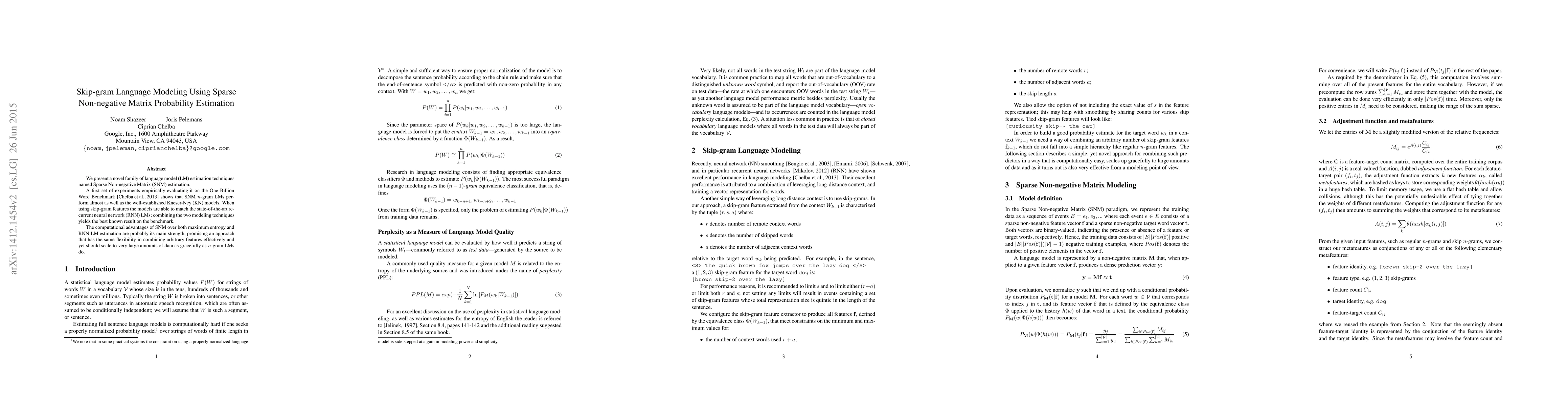 This paper introduces Sparse Non-negative Matrix (SNM) estimation techniques for language modeling, showing competitive performance with Kneser-Ney and recurrent neural network models on the One Billion Word Benchmark. The combination of SNM and skip-gram features yields the best known results, with computational advantages over maximum entropy and RNN models.