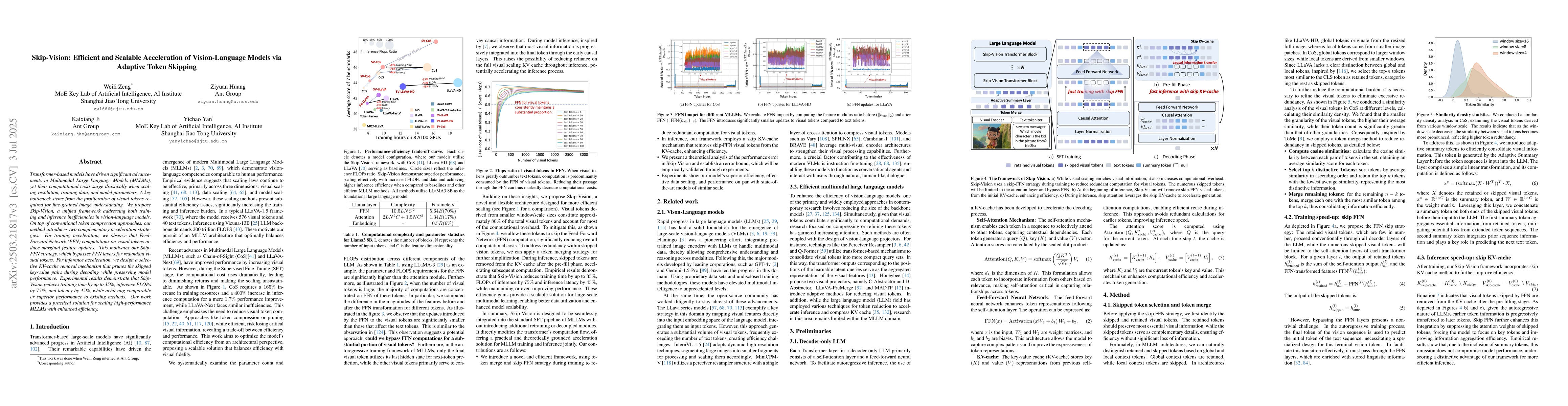 Transformer-based models have driven significant advancements in Multimodal Large Language Models (MLLMs), yet their computational costs surge drastically when scaling resolution, training data, and model parameters. A key bottleneck stems from the proliferation of visual tokens required for fine-grained image understanding. We propose Skip-Vision, a unified framework addressing both training and inference inefficiencies in vision-language models. On top of conventional token compression approaches, our method introduces two complementary acceleration strategies. For training acceleration, we observe that Feed-Forward Network (FFN) computations on visual tokens induce marginal feature updates. This motivates our Skip-FFN strategy, which bypasses FFN layers for redundant visual tokens. For inference acceleration, we design a selective KV-cache removal mechanism that prunes the skipped key-value pairs during decoding while preserving model performance. Experimental results demonstrate that Skip-Vision reduces training time by up to 35\%, inference FLOPs by 75\%, and latency by 45\%, while achieving comparable or superior performance to existing methods. Our work provides a practical solution for scaling high-performance MLLMs with enhanced efficiency.