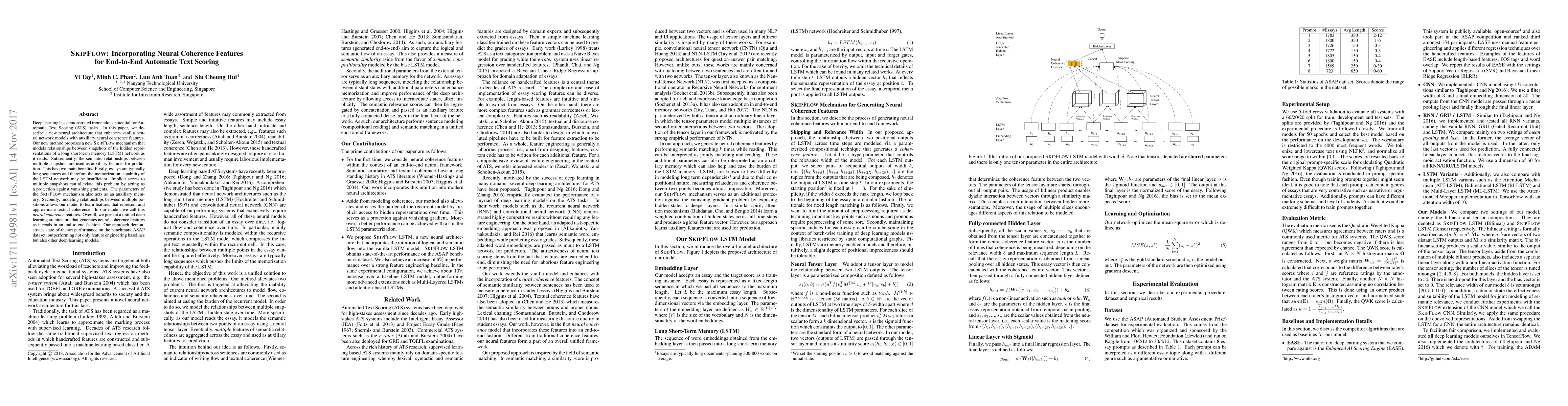 The paper introduces SkipFlow, a neural architecture that enhances Automatic Text Scoring (ATS) by incorporating neural coherence features. It uses a SkipFlow mechanism to model relationships between hidden representations of an LSTM network, providing auxiliary memory and coherence features that improve performance on the ASAP dataset.