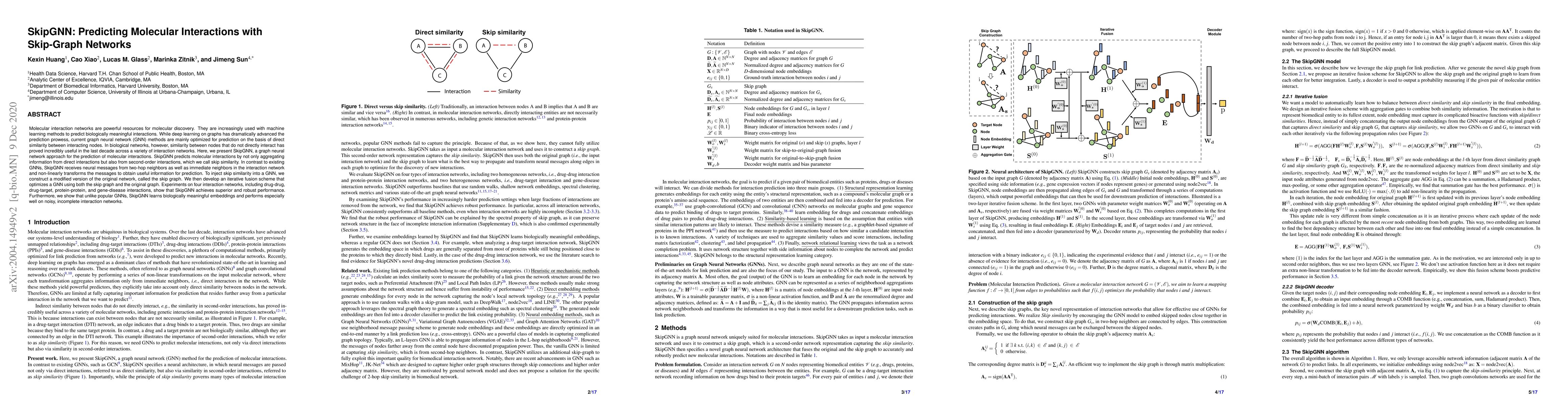Molecular interaction networks are powerful resources for the discovery. They are increasingly used with machine learning methods to predict biologically meaningful interactions. While deep learning on graphs has dramatically advanced the prediction prowess, current graph neural network (GNN) methods are optimized for prediction on the basis of direct similarity between interacting nodes. In biological networks, however, similarity between nodes that do not directly interact has proved incredibly useful in the last decade across a variety of interaction networks. Here, we present SkipGNN, a graph neural network approach for the prediction of molecular interactions. SkipGNN predicts molecular interactions by not only aggregating information from direct interactions but also from second-order interactions, which we call skip similarity. In contrast to existing GNNs, SkipGNN receives neural messages from two-hop neighbors as well as immediate neighbors in the interaction network and non-linearly transforms the messages to obtain useful information for prediction. To inject skip similarity into a GNN, we construct a modified version of the original network, called the skip graph. We then develop an iterative fusion scheme that optimizes a GNN using both the skip graph and the original graph. Experiments on four interaction networks, including drug-drug, drug-target, protein-protein, and gene-disease interactions, show that SkipGNN achieves superior and robust performance, outperforming existing methods by up to 28.8\% of area under the precision recall curve (PR-AUC). Furthermore, we show that unlike popular GNNs, SkipGNN learns biologically meaningful embeddings and performs especially well on noisy, incomplete interaction networks.