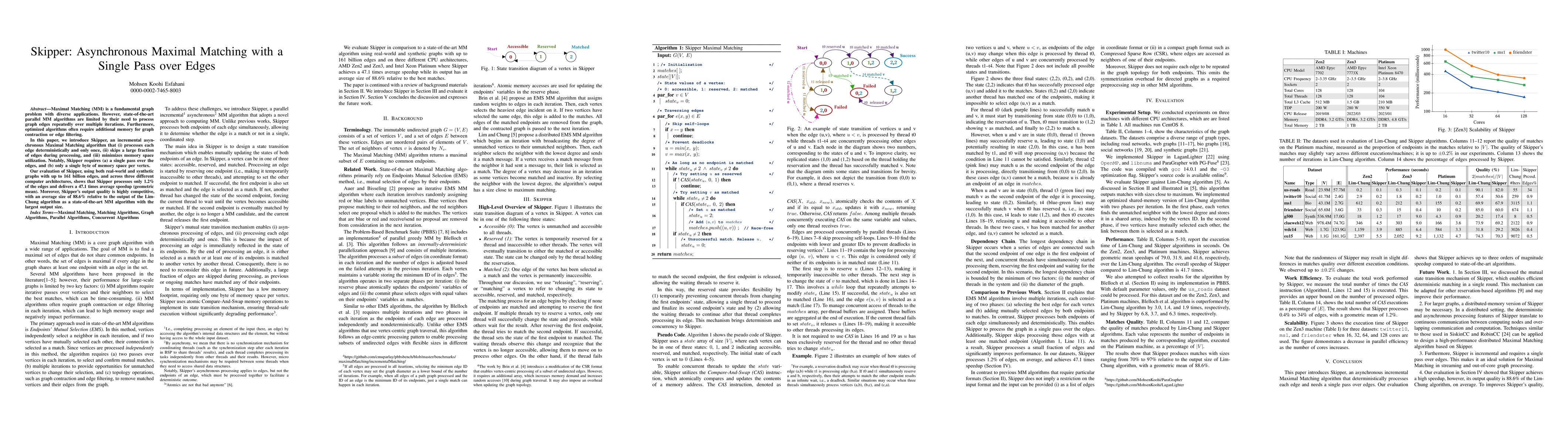 Maximal Matching (MM) is a fundamental graph problem with diverse applications. However, state-of-the-art parallel MM algorithms are limited by their need to process graph edges repeatedly over multiple iterations. Furthermore, optimized algorithms often require additional memory for graph contraction or edge filtering. In this paper, we introduce Skipper, an incremental asynchronous MM algorithm that (i) processes each edge deterministically and only once, (ii) skips a large fraction of edges during processing, and (iii) minimizes memory space utilization. Notably, Skipper requires (a) a single pass over the edges, and (b) only a single byte of memory space per vertex. Our evaluation of Skipper, using both real-world and synthetic graphs with up to 161 billion edges, and across three different computer architectures, shows that Skipper processes only 1.2% of the edges and delivers a 47.1 times average speedup (geometric mean). Moreover, Skipper's output quality is highly competitive, with an average size of 88.6% relative to the output of the Lim-Chung algorithm as a state-of-the-art MM algorithm with the largest output size.