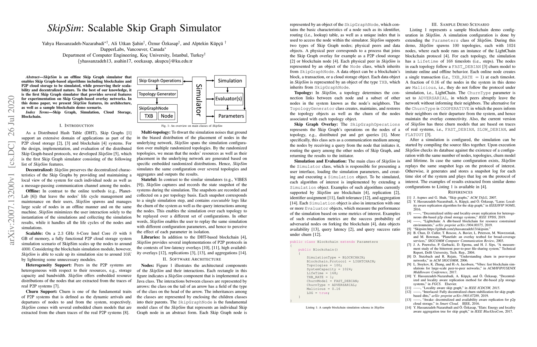 SkipSim is an offline simulator for Skip Graph-based algorithms, preserving scalability and decentralization. It offers unique features for experimenting with Skip Graph overlay networks, demonstrated through a blockchain scenario.