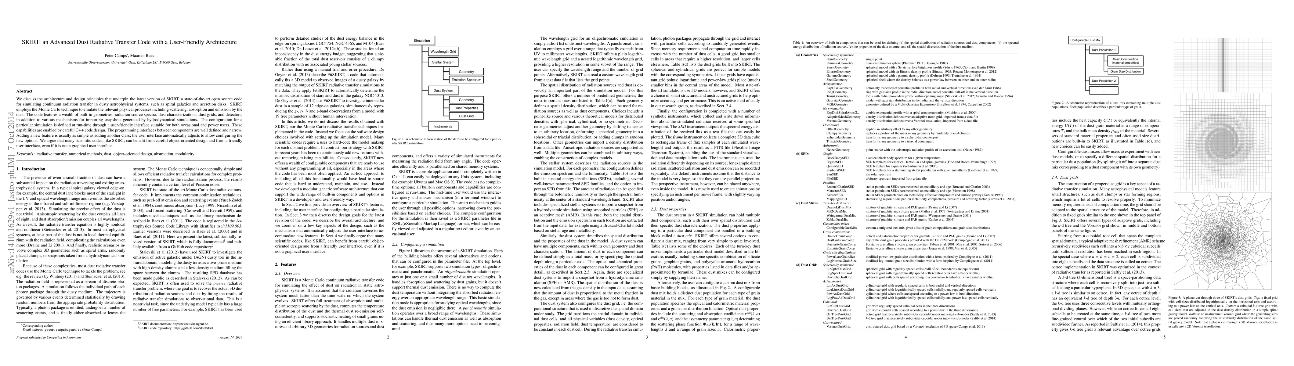 SKIRT is an advanced open-source code for simulating radiation transfer in dusty astrophysical systems using the Monte Carlo technique. It features a user-friendly architecture that allows for easy configuration and extension, emphasizing object-oriented design for efficient development.