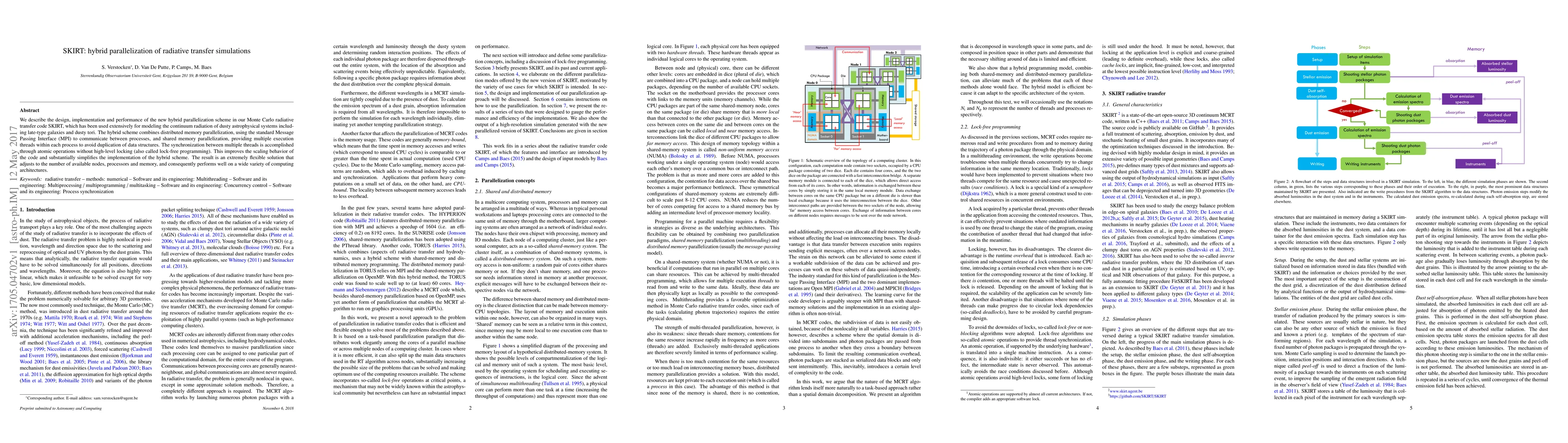 SKIRT introduces a hybrid parallelization scheme combining MPI and multi-threading for efficient Monte Carlo radiative transfer simulations, achieving better scalability and performance across diverse computing architectures through lock-free programming. This approach enhances the modeling of continuum radiation in dusty astrophysical systems.