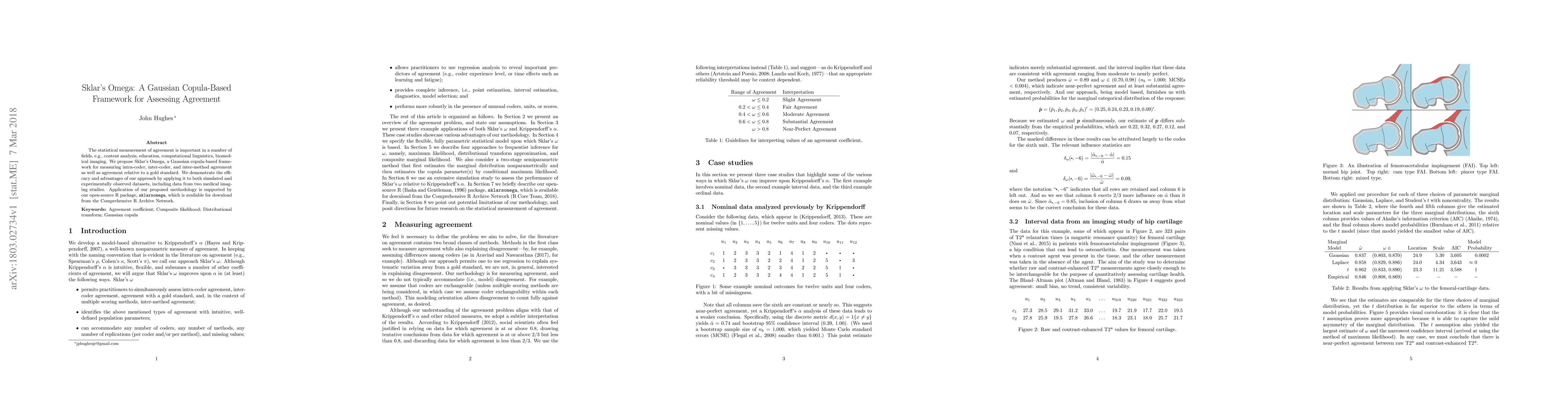 The statistical measurement of agreement is important in a number of fields, e.g., content analysis, education, computational linguistics, biomedical imaging. We propose Sklar's Omega, a Gaussian copula-based framework for measuring intra-coder, inter-coder, and inter-method agreement as well as agreement relative to a gold standard. We demonstrate the efficacy and advantages of our approach by applying it to both simulated and experimentally observed datasets, including data from two medical imaging studies. Application of our proposed methodology is supported by our open-source R package, sklarsomega, which is available for download from the Comprehensive R Archive Network.