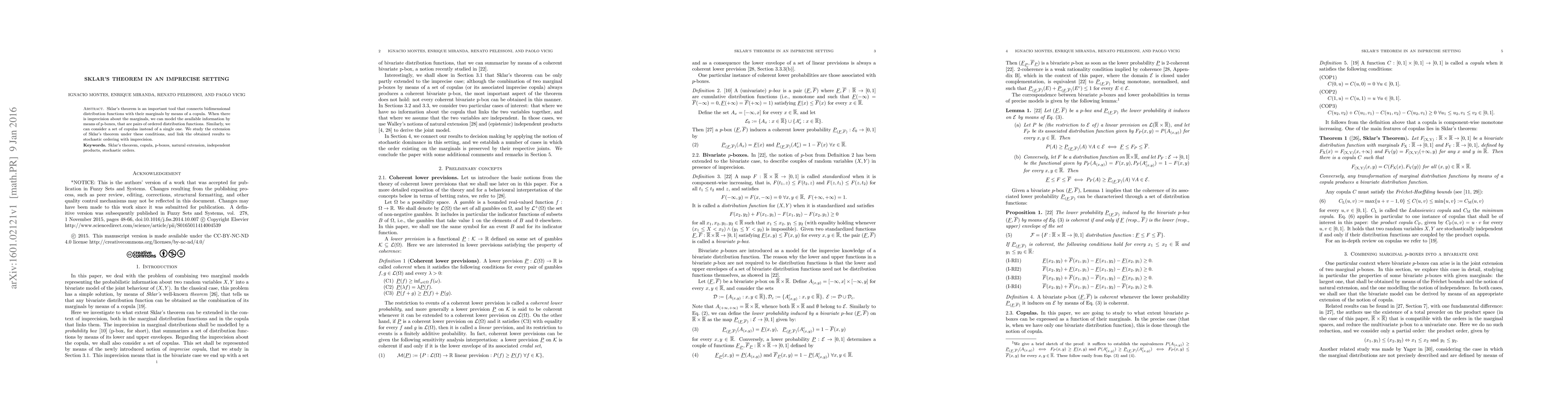 Sklar's theorem is extended to an imprecise setting where marginals are represented by p-boxes and copulas are considered as sets. The study links these extensions to stochastic ordering under imprecision.