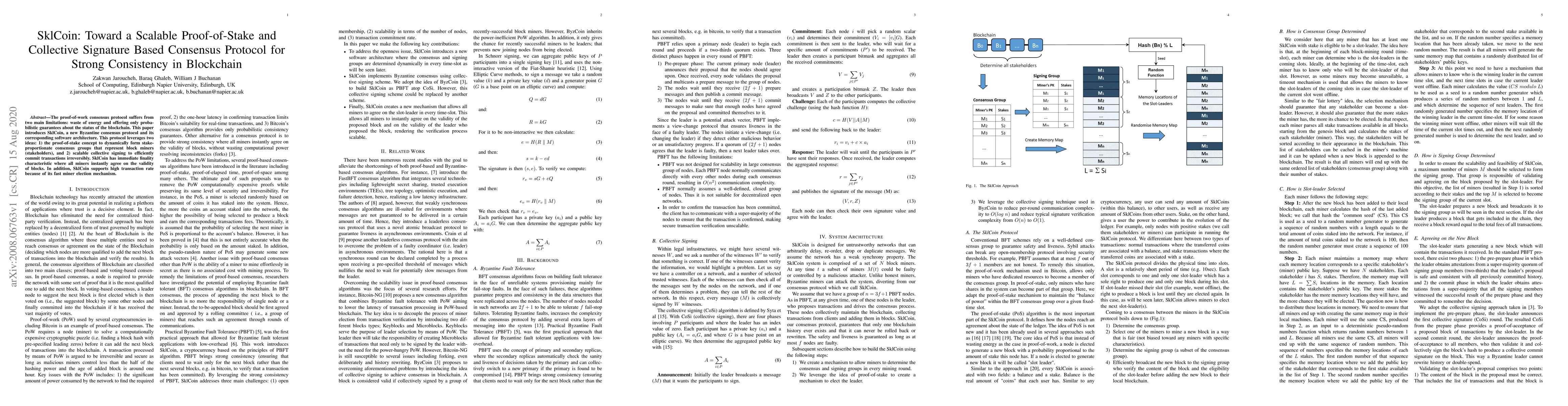 SklCoin introduces a scalable proof-of-stake and collective signature consensus protocol to address the energy inefficiency and probabilistic guarantees of proof-of-work. It achieves strong consistency and high transaction rates through dynamic consensus group formation and efficient transaction committing.